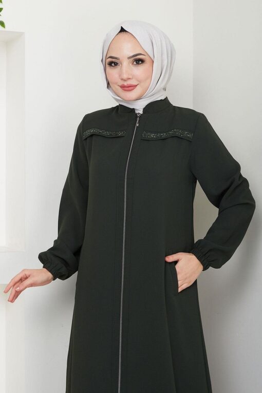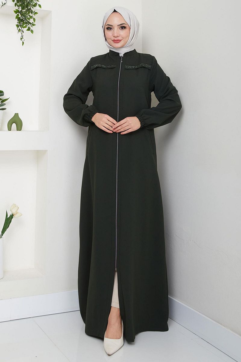 مميزات المنتج: موديل عباية بتفاصيل حجرية من الأمام. يُغلق بسحاب في الأمام. يتميز بأكمام مطاطية، وياقة واقفة، وجيوب بغطاء قلاب. الأكتاف مبطنة وغير مبطنة. قد يكون هناك اختلاف في لون المنتج بسبب اللقطات المفاهيمية.