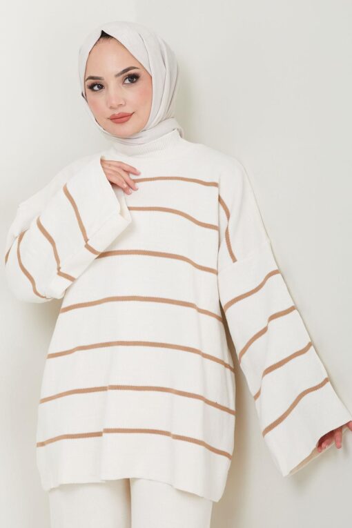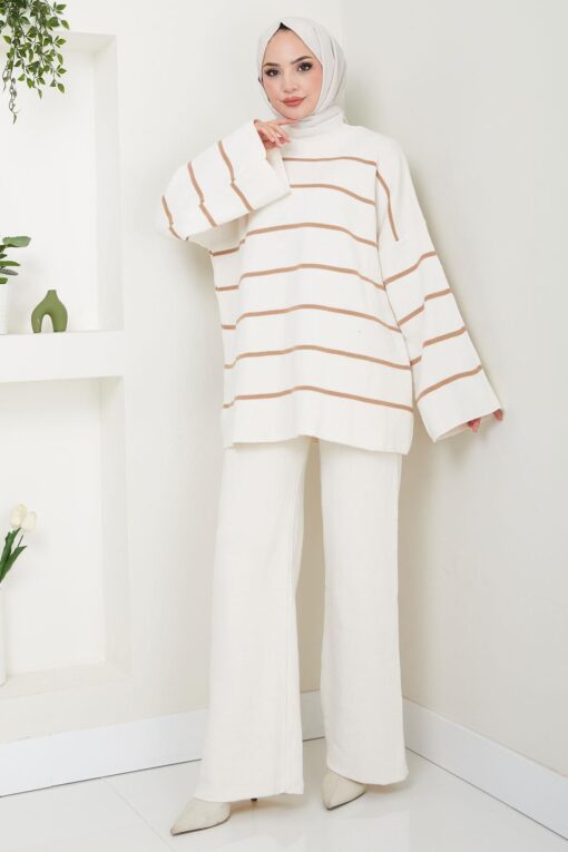 ميزة المنتج: هو نموذج بدلة تريكو مخططة تتكون من سترة نصف الياقة المدورة وبنطلون مناسب للاستخدام في فصل الشتاء. إنه مقاس قياسي ومناسب لنطاق المقاسات 36-42. قد يكون هناك اختلاف في لون المنتج بسبب اللقطات المفاهيمية.