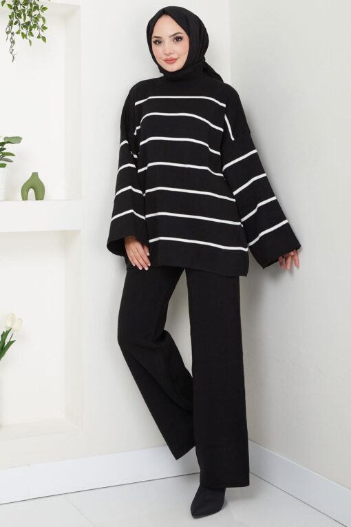 مميزات البدلة التريكو المخططة نصف الياقة المدورة باللون الأسود HM2553
