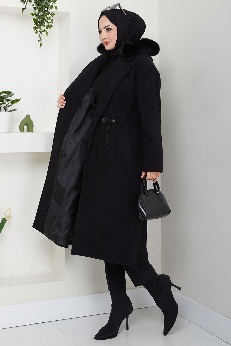 ملامح معطف الخصر الرباط مقنعين أسود HM2604