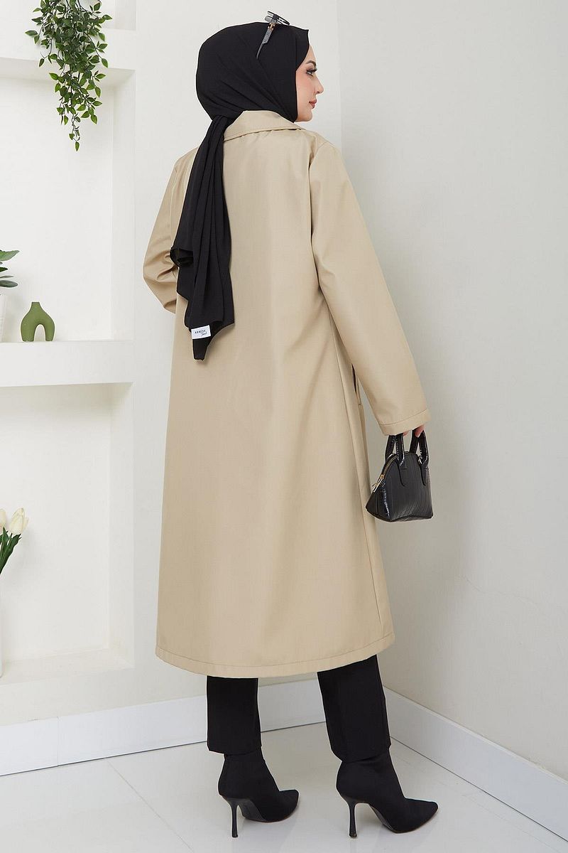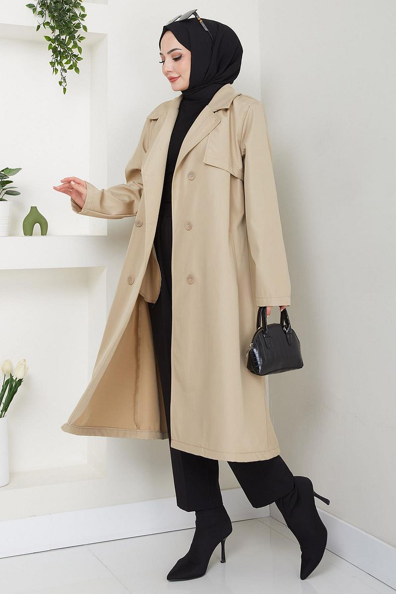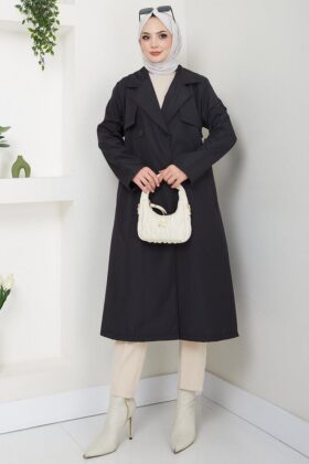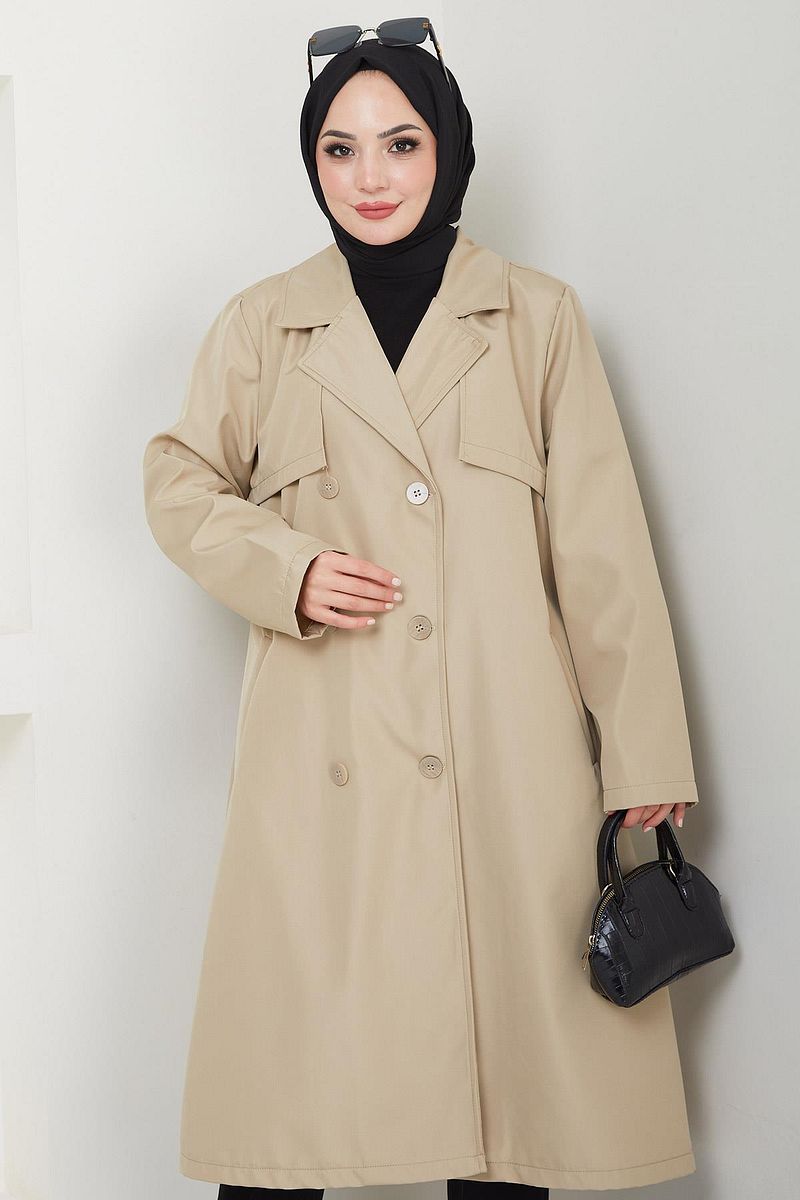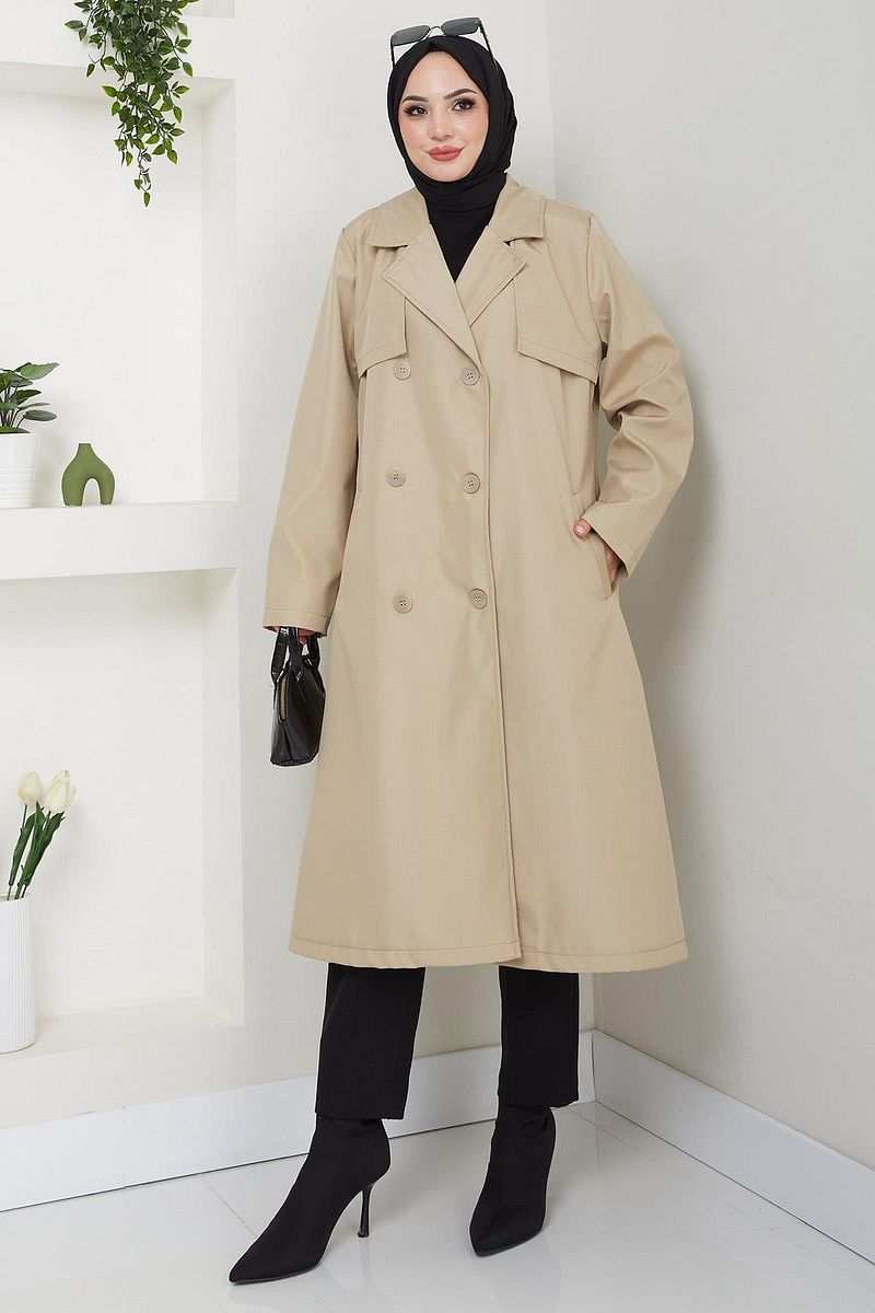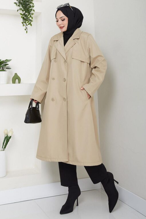 ميزات المنتج: أزرار أمامية، ياقة مزدوجة الصدر، موديل معطف واقٍ من المطر بمقاس كبير. تحتوي على جيبين بغطاء قلاب وغير مبطنة. قد يكون هناك اختلاف في درجة اللون في لون المنتج بسبب اللقطات المفاهيمية.