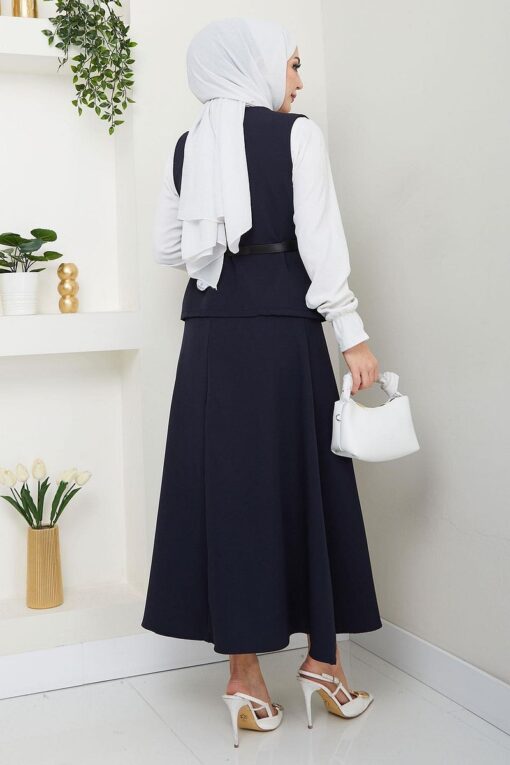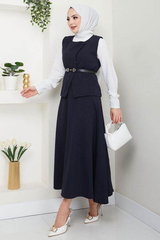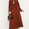 ميزات المنتج: إنه نموذج بدلة نسائية مكونة من قطعتين تتكون من سترة وتنورة. الحزام مفصل. السترة مزودة بأزرار، ويمكن فك الأزرار. خصر التنورة مرن. قد تكون هناك اختلافات في درجة لون المنتج بسبب اللقطات المفاهيمية.