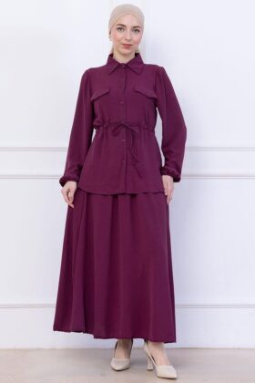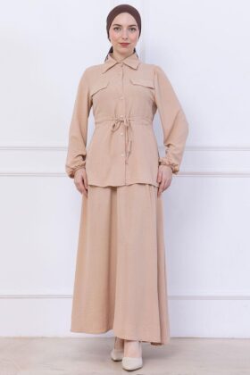 ميزة المنتج: إنه نموذج بدلة مكون من قطعتين يتكون من قميص وتنورة. خصر التنورة مرن. القميص مزود بأزرار في جميع أنحائه وله ربطة عند الخصر. إن جيوب القميص مخصصة للزينة فقط، ولا توجد جيوب متاحة. قد تكون هناك اختلافات في لون المنتج بسبب اللقطات المفاهيمية.