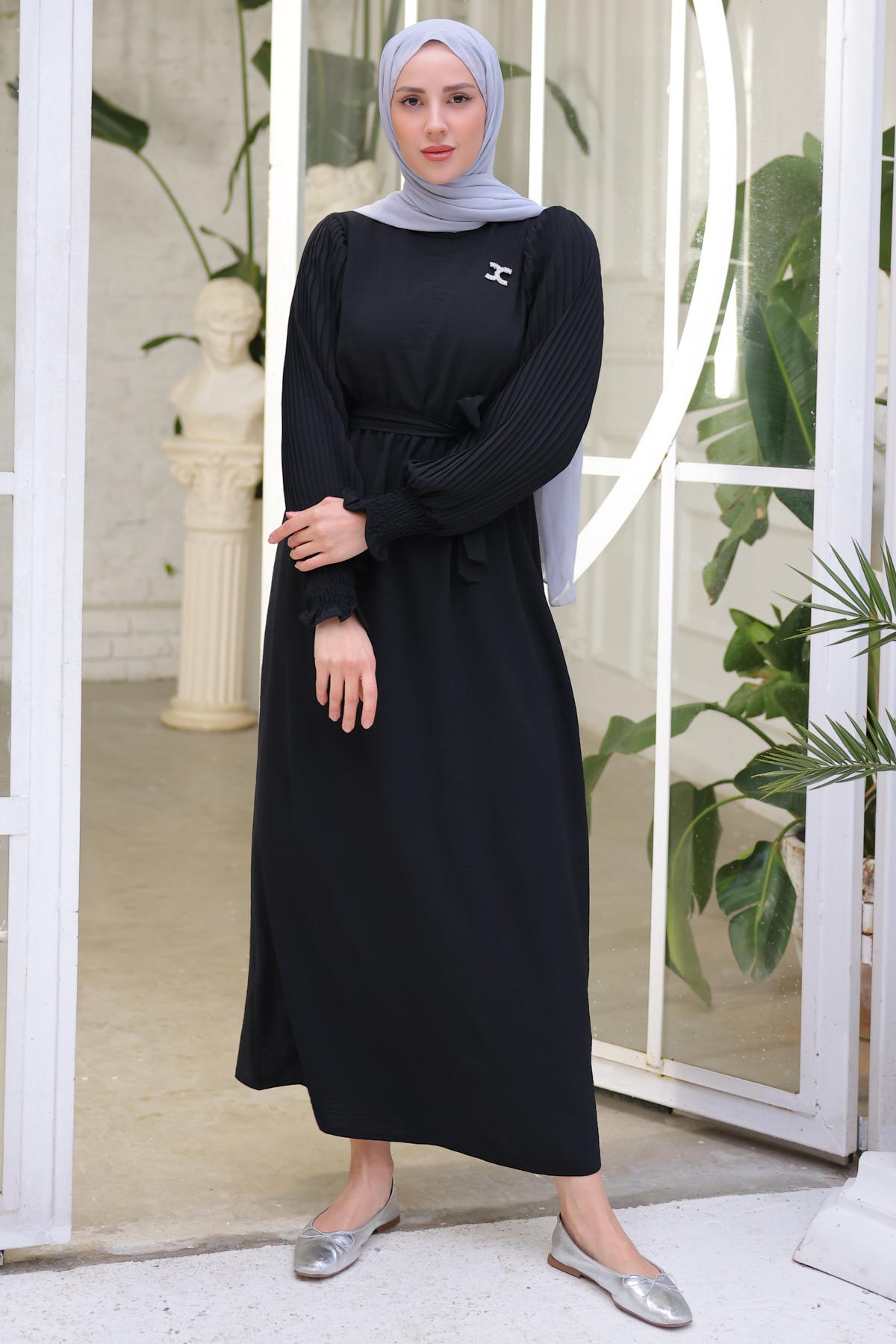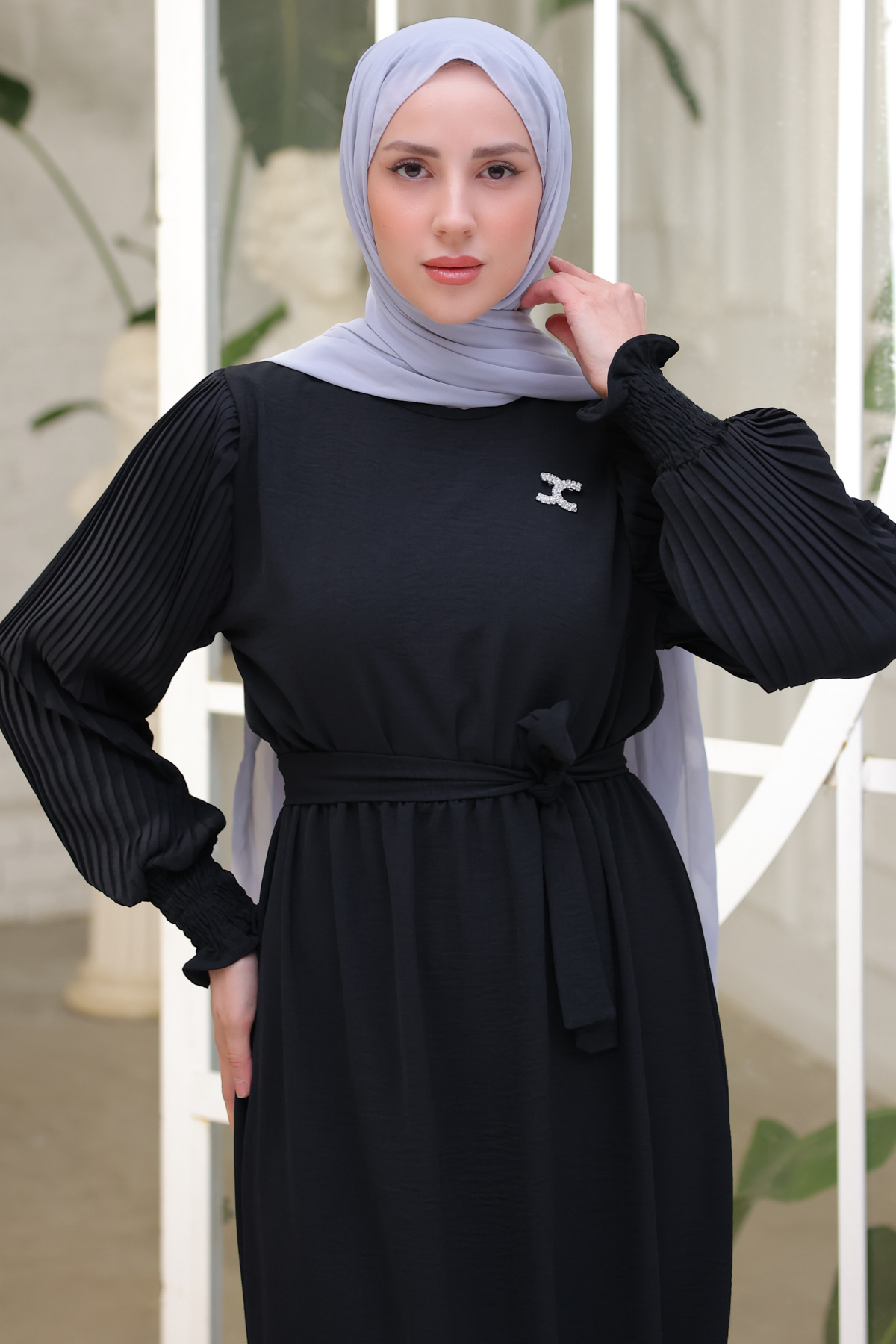 مميزات المنتج: المنتج ذو مقاس عادي، يمكنك أخذ مقاسك الخاص معلومات المنتج: الارتفاع: 139 سم الصدر: 88 سم الخصر: 58 سم القماش: 50 فيسكوز بوليستر %5 ليكرا قياسات الموديل: الارتفاع: 178 سم، الصدر: 80 سم. الخصر: 70 سم الورك: 82 سم المنتج الموجود في الموديل M/38 قد يكون هناك اختلاف في لون المنتج بسبب التصوير المفاهيمي. تتميز أكمام فستان الموسم الجديد بنمط مطوي وتكتمل الأناقة تفاصيل بروش. خصر فستاننا مرن.