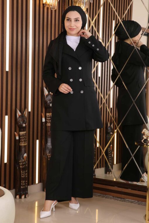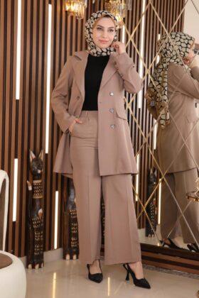 ميزة المنتج: إنه منتج أزياء للمحجبات للموسم الجديد وغير مُبطن. السترة بها أزرار يمكن استخدامها في الأمام. أزرار الكفة هي إكسسوارات. السراويل لها سحاب أمامي وزر. الخصر مرن في الخلف. قد يكون هناك اختلاف نغمي في لون المنتج بسبب لقطات المفهوم.