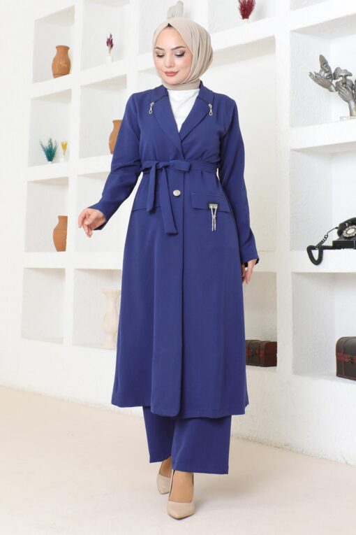 ميزة المنتج: إنه منتج أزياء الحجاب للموسم الجديد. إنه غير مُبطن. تحتوي السترة على زرين في الأمام. تحتوي على سحاب تفصيلي على الكتف. حزامه متحرك. يتميز البنطلون بخصر مطاطي. قد يكون هناك اختلاف في درجة اللون في لون المنتج بسبب اللقطات المفاهيمية.