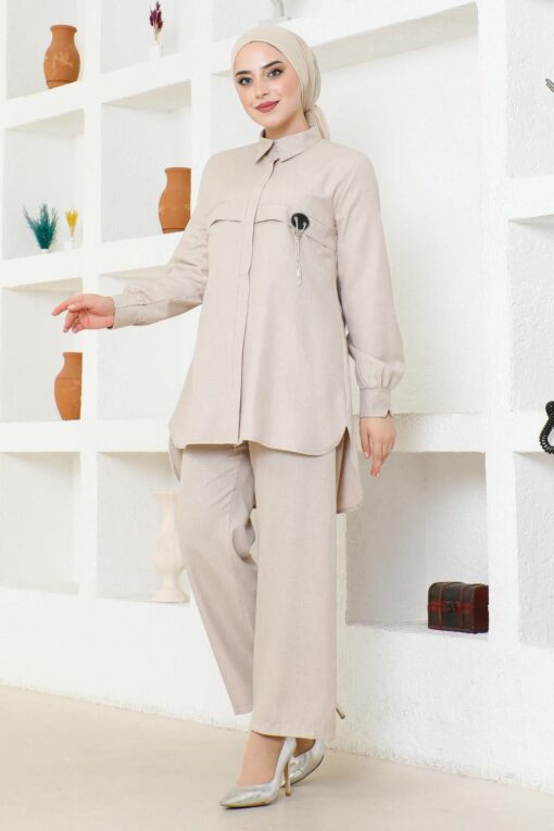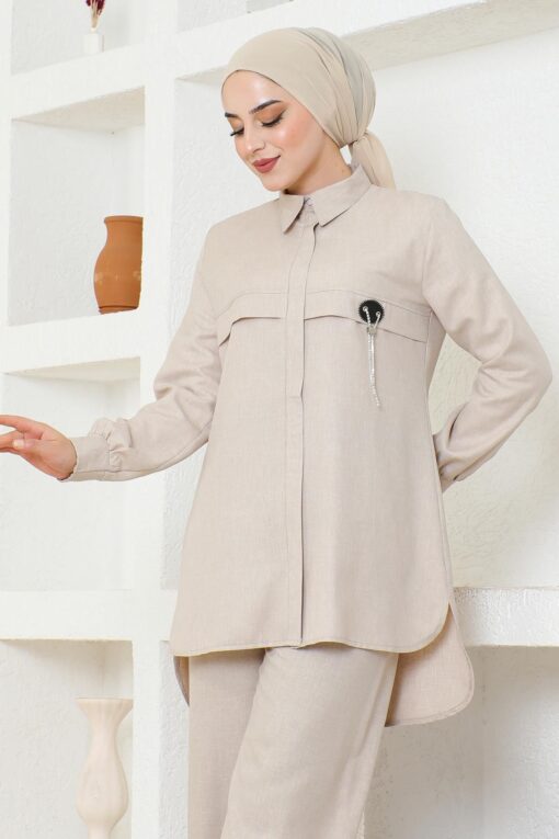 مميزات القماش: مصنوع من قماش الكتان المختلط. ميزة المنتج: إنه منتج أزياء الحجاب للموسم الجديد. إنه غير مُبطن. التونيك مزود بسحاب مخفي في الأمام. جزء الرقبة والكفة لها تفاصيل حجرية. يتميز البنطلون بخصر مطاطي. قد يكون هناك اختلاف في لون المنتج بسبب اللقطات المفاهيمية. مقاس 38 على الموديل جدول المقاسات متوفر بالصور.