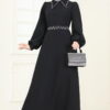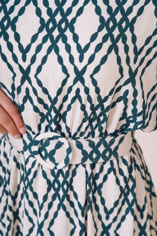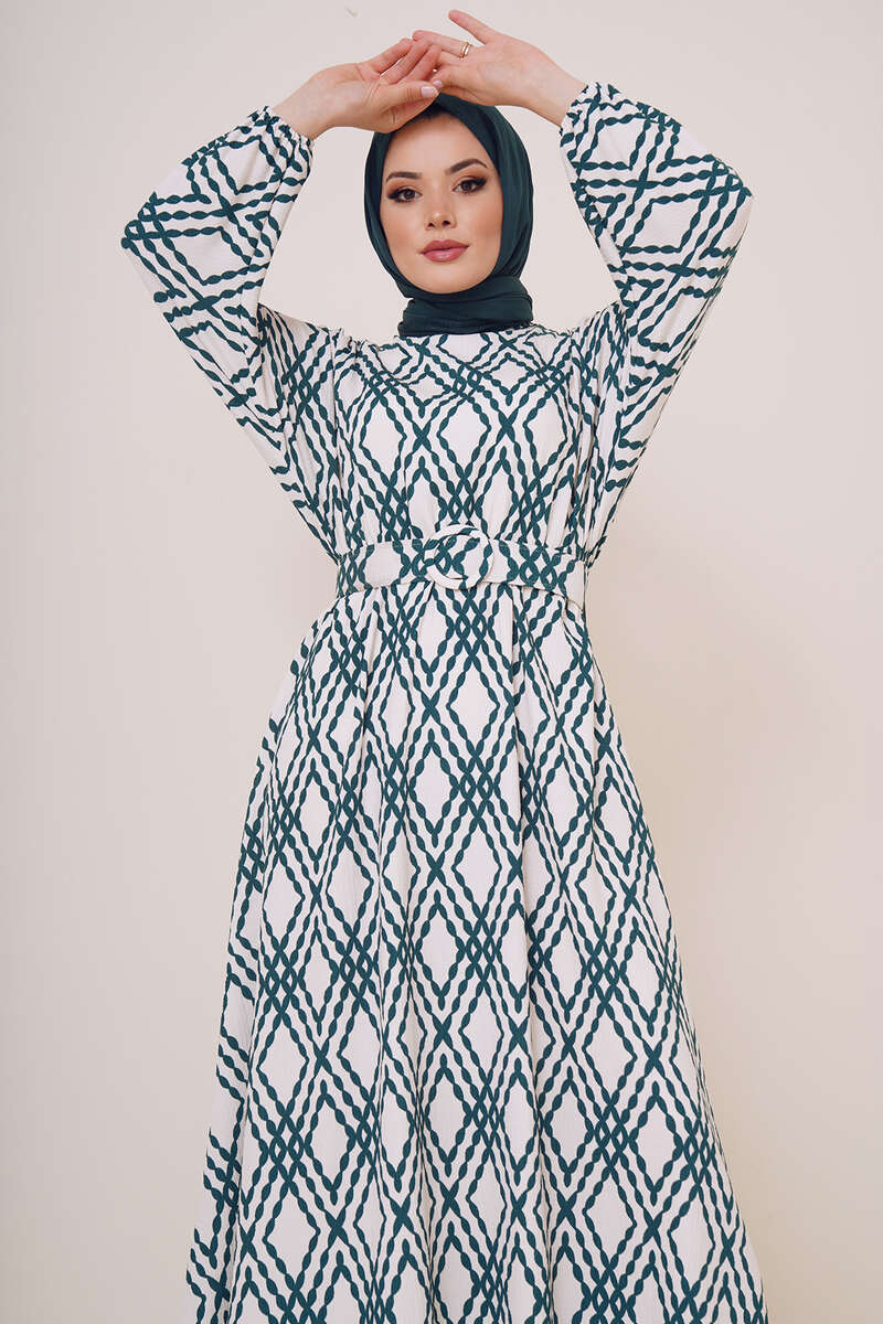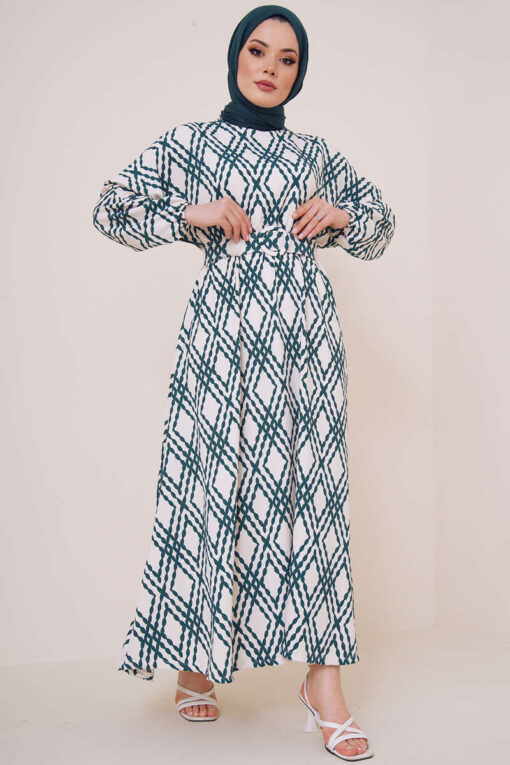 فستاننا للموسم الجديد يجذب الانتباه بأنماطه المختلفة. فستاننا ذو الرقبة البيضاوية يحتوي على حزام بنمطه الخاص. الخصر والمعصم في فستاننا مرنان.