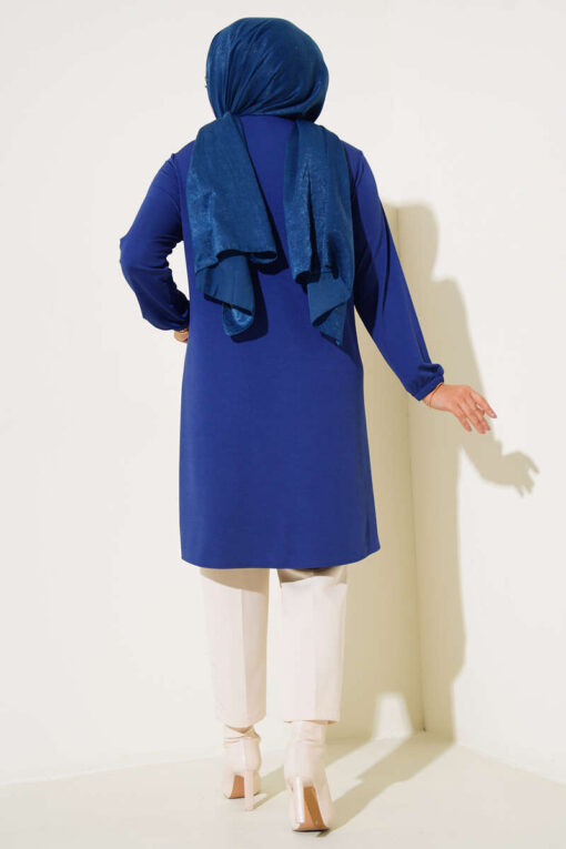 اكتسب التونيك ذو المقاسات الكبيرة للموسم الجديد زخمًا مع تفاصيل الكشكشة على الصدر. الكشكشة مصحوبة بالترتر اللامع الصغير وأزرار الزينة. يتميز التونيك الخاص بنا بوجود معصمين مطاطيين وبه فتحات عند الحاشية.