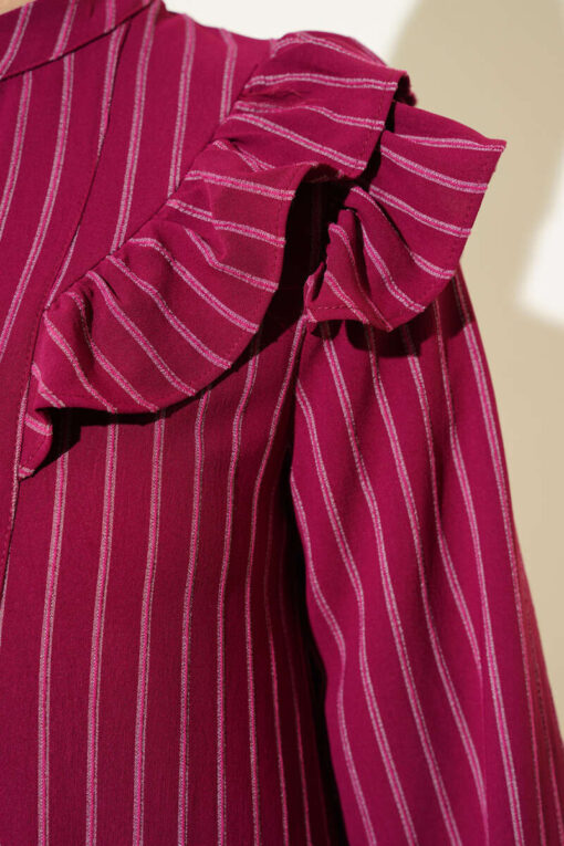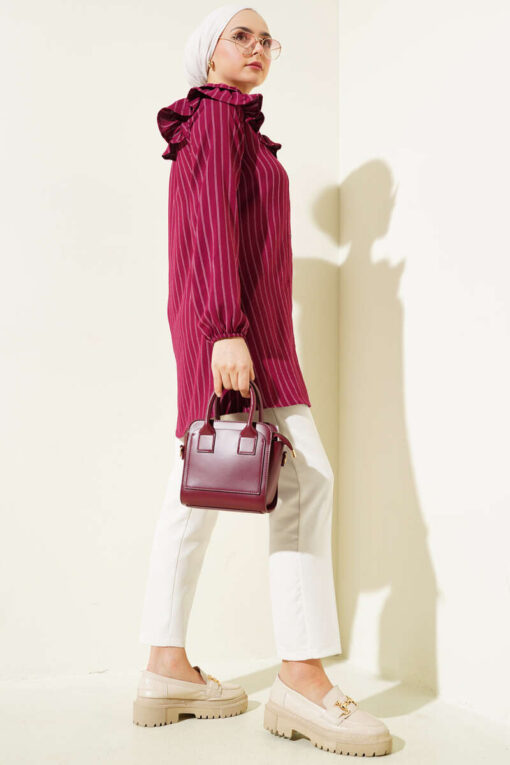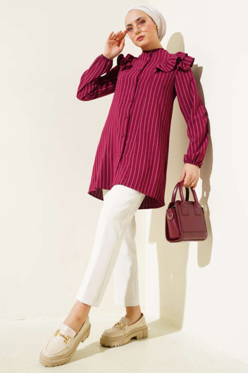 لقد وصل إليك تونيك موديل الموسم الجديد بتصميمه الأنيق والبسيط. أكتاف وياقة سترتنا مكشكشة. المعصمين مرنين. لديها أزرار في الأمام. إنه نموذج مخطط. سترتنا نالت إعجابك بتصميمها الأنيق. خيارات الألوان متاحة.