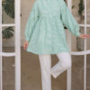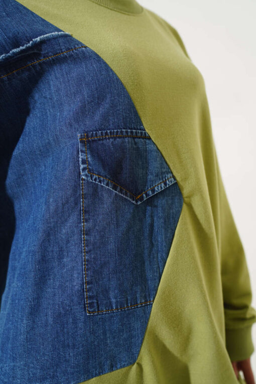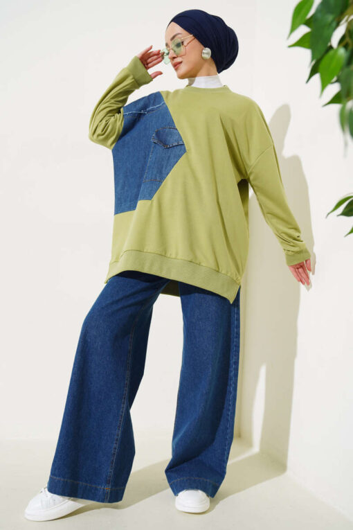 سترة الموسم الجديد لدينا مصنوعة من الدنيم. تضيف تفاصيل الجيب ذات القلاب الحركة إلى السترة الخاصة بنا. التونيك الخاص بنا، وهو موديل منخفض الكتف، له رقبة دائرية. يتميز التونيك الخاص بنا بفتحات عند الحاشية وأساور وياقة مضلعة.