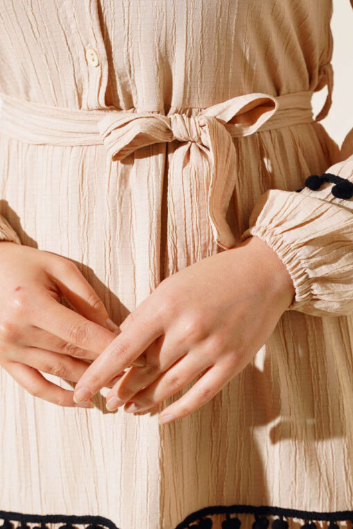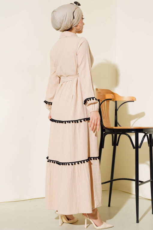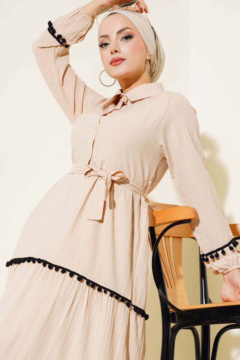 فستان الموسم الجديد لدينا معك. تتميز الأكمام والتنورة في فستاننا بتفاصيل كرات بوم بوم. فستاننا ذو ياقة قميص ومزرّر إلى المنتصف. يحتوي على حلقتين للحزام حول خصره وحزام مصنوع من القماش الخاص به. المعصمين مرنين. فستاننا مع خيارات الألوان ينتظر مكانه في خزائن ملابسك.