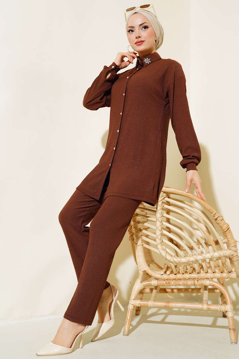 نموذج الفريق المزدوج للموسم الجديد معك. طوق السترة الخاصة بنا به تفاصيل حجرية. يجب أن يكون مزررًا على طول الطريق. لديها الأصفاد والأزرار. لديها تفاصيل زر اللؤلؤ. خصر بنطالنا مرن. إنه نموذج بدون جيوب. البدلة المريحة للغاية المكونة من قطعتين في انتظارك مع خيارات الألوان.