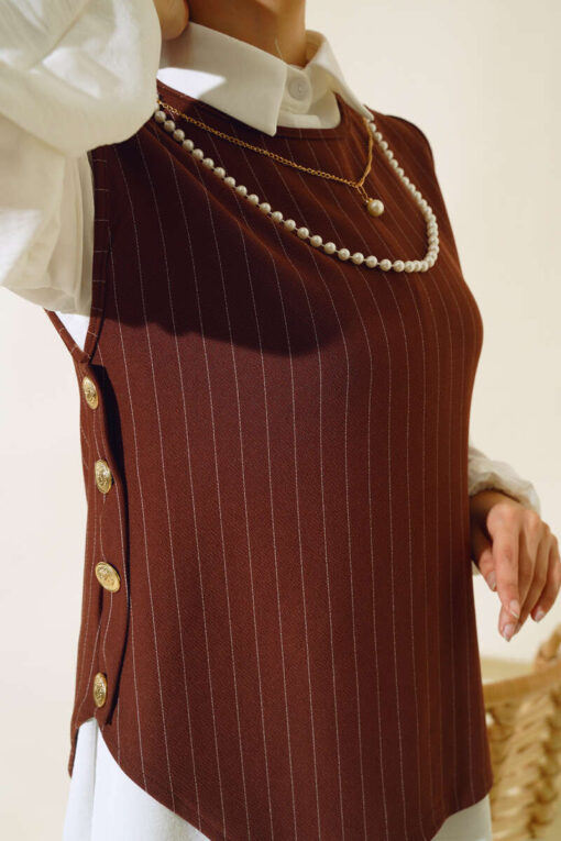 سوف يعجبك موديل البدلة الثلاثية للموسم الجديد. يجب أن تكون جوانب سترتنا مزررة. نموذج قميصنا هو القماش. المعصمين مرنين. الجزء الأمامي من قميصنا هو نموذج بأزرار سفلية. خصر بنطالنا مرن. إنه نموذج بدون جيوب. إنه نموذج ذو أرجل واسعة. يتوفر نموذج البدلة المخططة المكونة من ثلاث قطع بخيارات الألوان. تم استخدام القلادة كملحق.