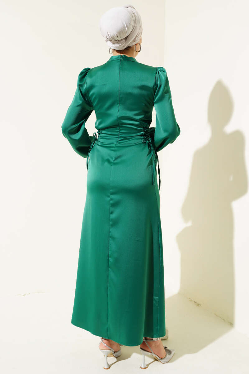 يقدم فستان الساتان للموسم الجديد مظهرًا جميلاً للغاية بتصميمه البسيط والأنيق. يمكن ربط وتجميع تفاصيل الحبل على الجانبين. يتميز فستاننا بخط رقبة مهيمن ومعصمين مطاطيين وظهر بسحاب.