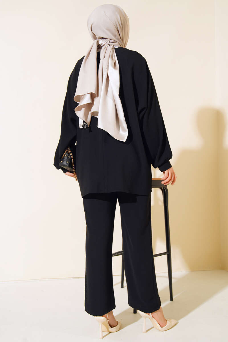الساق: 40 سم، موديل البدلة المزدوجة الشهير لهذا الموسم موجود معك هنا. سترتنا، وهي موديل مستقيم، لها أكمام خفاش. إنه نموذج كبير الحجم. لديها سحاب في الخلف. خصر بنطالنا مرن. إنه نموذج بدون جيوب. إنه نموذج ذو أرجل واسعة. يتميز نموذج البدلة المزدوجة لدينا بخيارات الألوان.