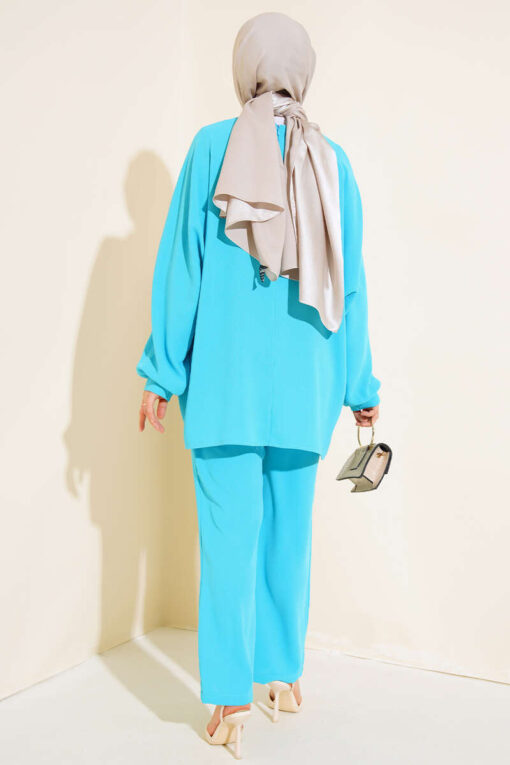 الساق: 40 سم، موديل البدلة المزدوجة الشهير لهذا الموسم موجود معك هنا. سترتنا، وهي موديل مستقيم، لها أكمام خفاش. إنه نموذج كبير الحجم. لديها سحاب في الخلف. خصر بنطالنا مرن. إنه نموذج بدون جيوب. إنه نموذج ذو أرجل واسعة. يتميز نموذج البدلة المزدوجة لدينا بخيارات الألوان.