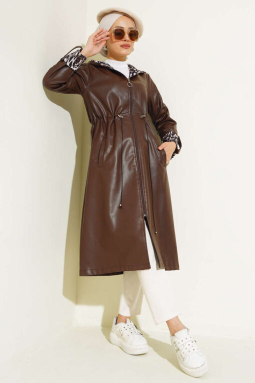 يتميز معطف المطر الجلدي للموسم الجديد بخصر مطاطي. يحتوي معطف الخندق على سحاب كامل الطول وغطاء للرأس. يحتوي الجزء الداخلي من القلنسوة على تفاصيل النمر. أجزاء المعصم من معطف المطر الخاص بنا، غير المبطنة من الداخل، مبطنة بالليوبر من الداخل.
