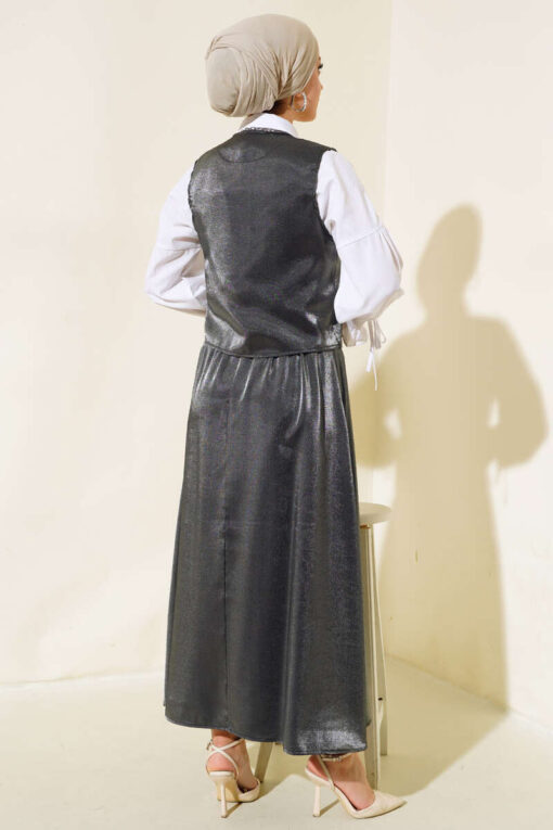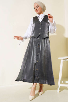 نموذج الفريق المزدوج للموسم الجديد معك. الجزء الأمامي من سترتنا مزرر. إنه نموذج قصير. خصر تنورتنا مرن. يحتوي على زخرفة زر كاملة الطول في المقدمة. وهو نموذج غير المبطنة. بدلتنا الأنيقة والأنيقة ستناسبك جيدًا.