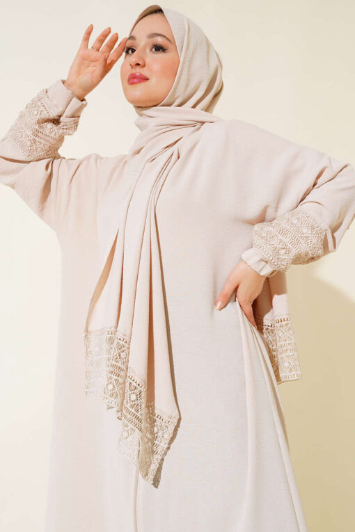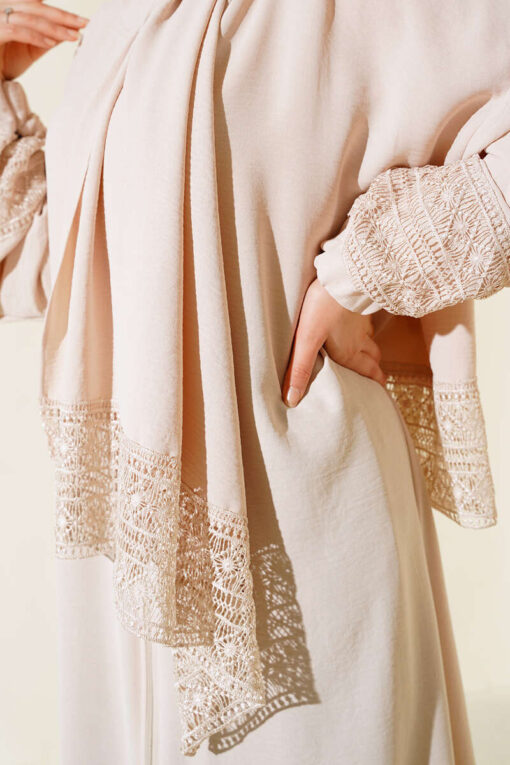 موديل عبايات الموسم الجديد معكم. عبايتنا الشبيهة بالشال هي موديل واسع. الأكمام من الدانتيل. تحتوي على سحاب كامل الطول. موديل العباءة مع نهاية شال من الدانتيل متوفر بخيارات الألوان.