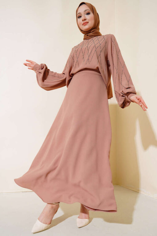 موديل البدلة ذات التنورة المزدوجة للموسم الجديد موجود معك هنا. تم تزيين الجزء الأمامي والأكمام من سترتنا بالحجارة. يتميز التونيك الخاص بنا بأكمام واسعة وسحاب خلفي. يتم زرر المعصمين بالأصفاد. تنورتنا هي موديل واسع وبها سحاب.