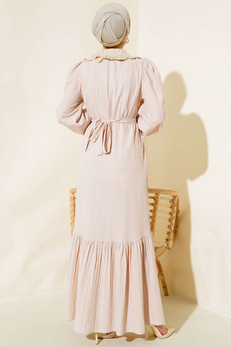 فستان الموسم الجديد الخاص بنا هو من بين المفضلات لهذا الموسم بملمسه الناعم وأسلوبه المريح. أزرار الياقة، التي تؤثر على المظهر الأنيق لفستاننا مع ياقة الأطفال المُجبرة، هي نفس لون فستاننا. يتميز فستاننا بمعصمين مطاطيين وخصر بحزام.