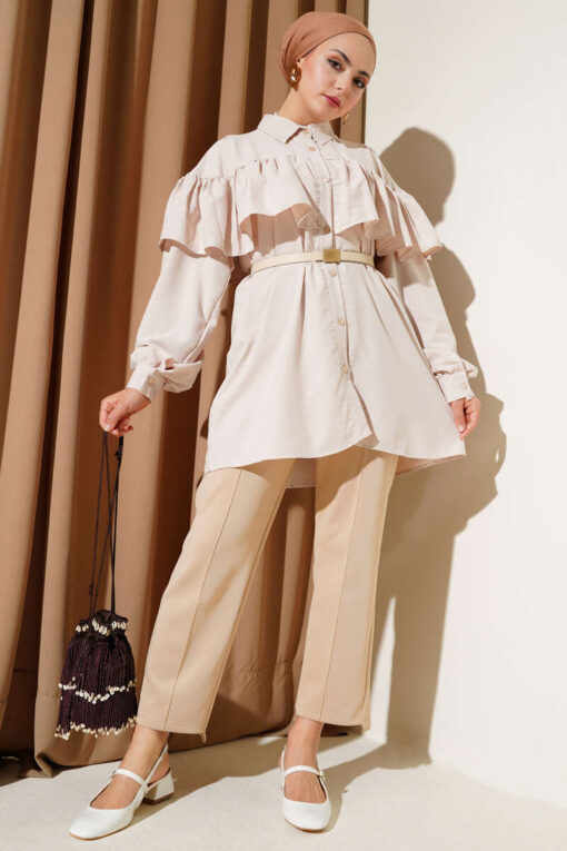 معلومات الموديل الارتفاع: 167 سم الصدر: 87 سم الخصر: 67 سم الورك: 91 سم مقاس المنتج الموجود على الموديل هو S/M.