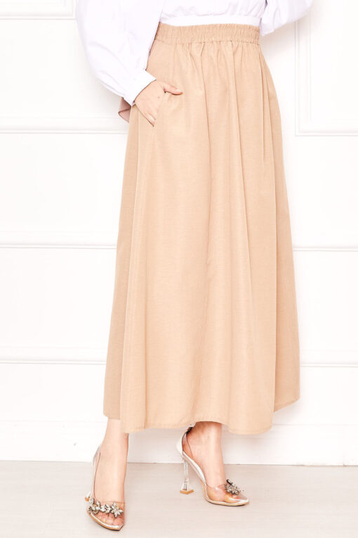 يمكن استخدام المنتج في أربعة فصول. جيوب جانبية. التنورة عبارة عن نموذج جرس. يتميز المنتج بخصر مطاطي وهيكل مرن وجيبين.