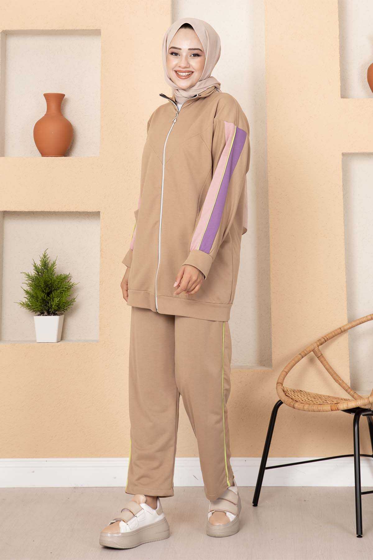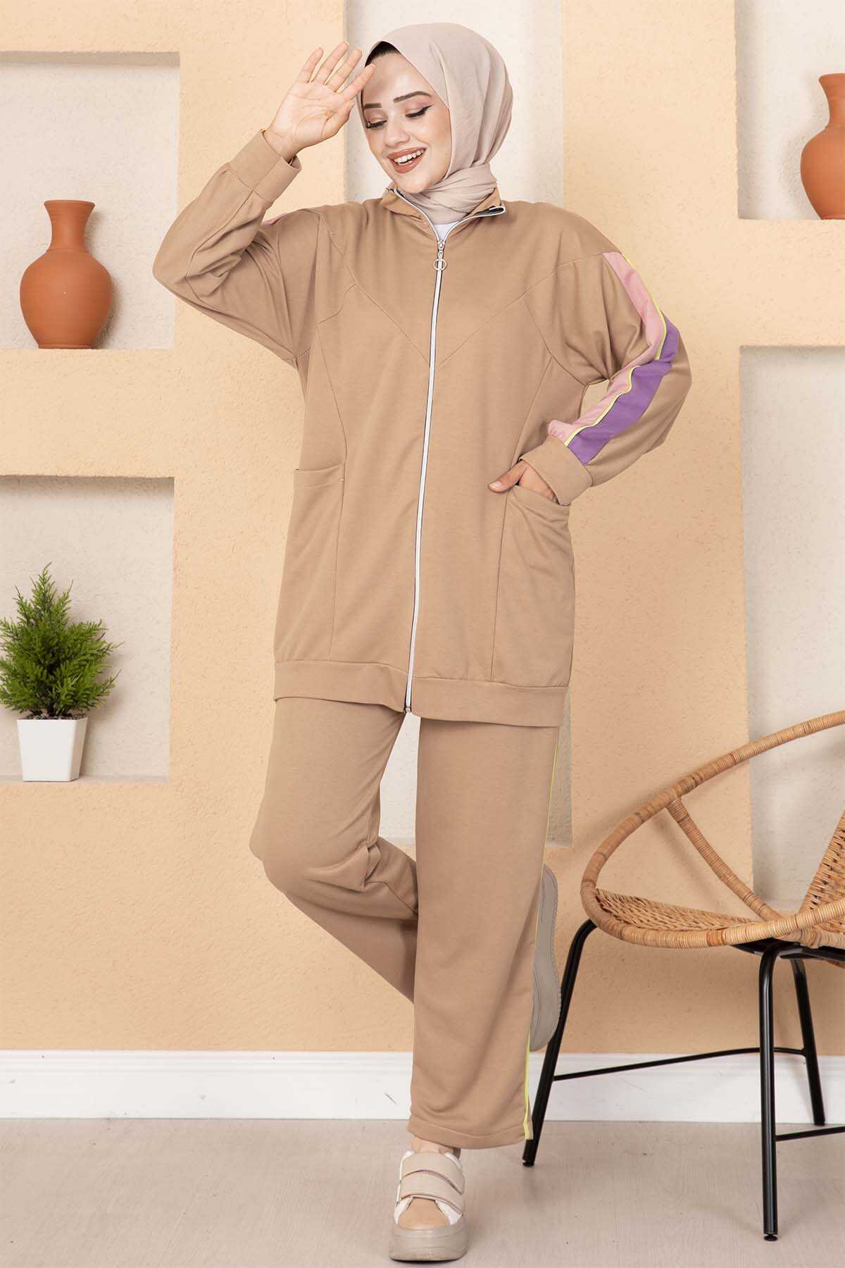 المنتج موسمي. يتكون المنتج من قطعتين: تونيك وبنطلون. تحتوي السترة على سحاب وجيوب كاملة الطول. تتميز السراويل بخصر مطاطي