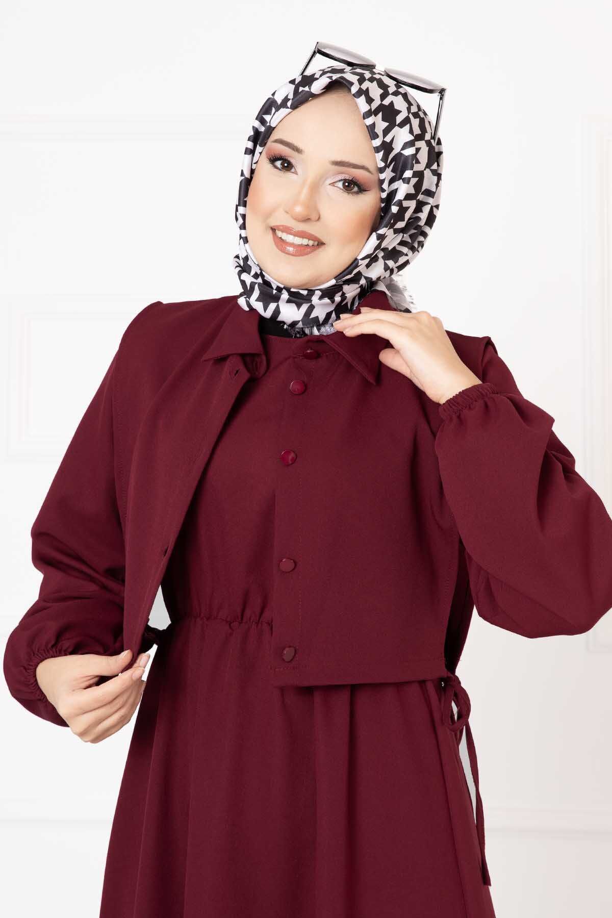 المنتج موسمي. يتميز الفستان بفتحة رقبة دائرية وأزرار منسدلة على الظهر وخصر مجمع. يحتوي المحصول على أزرار نشطة وتفاصيل ربطة جانبية