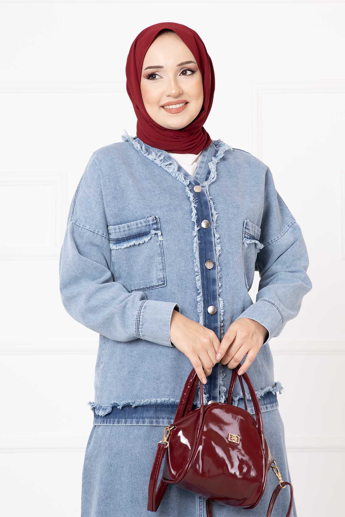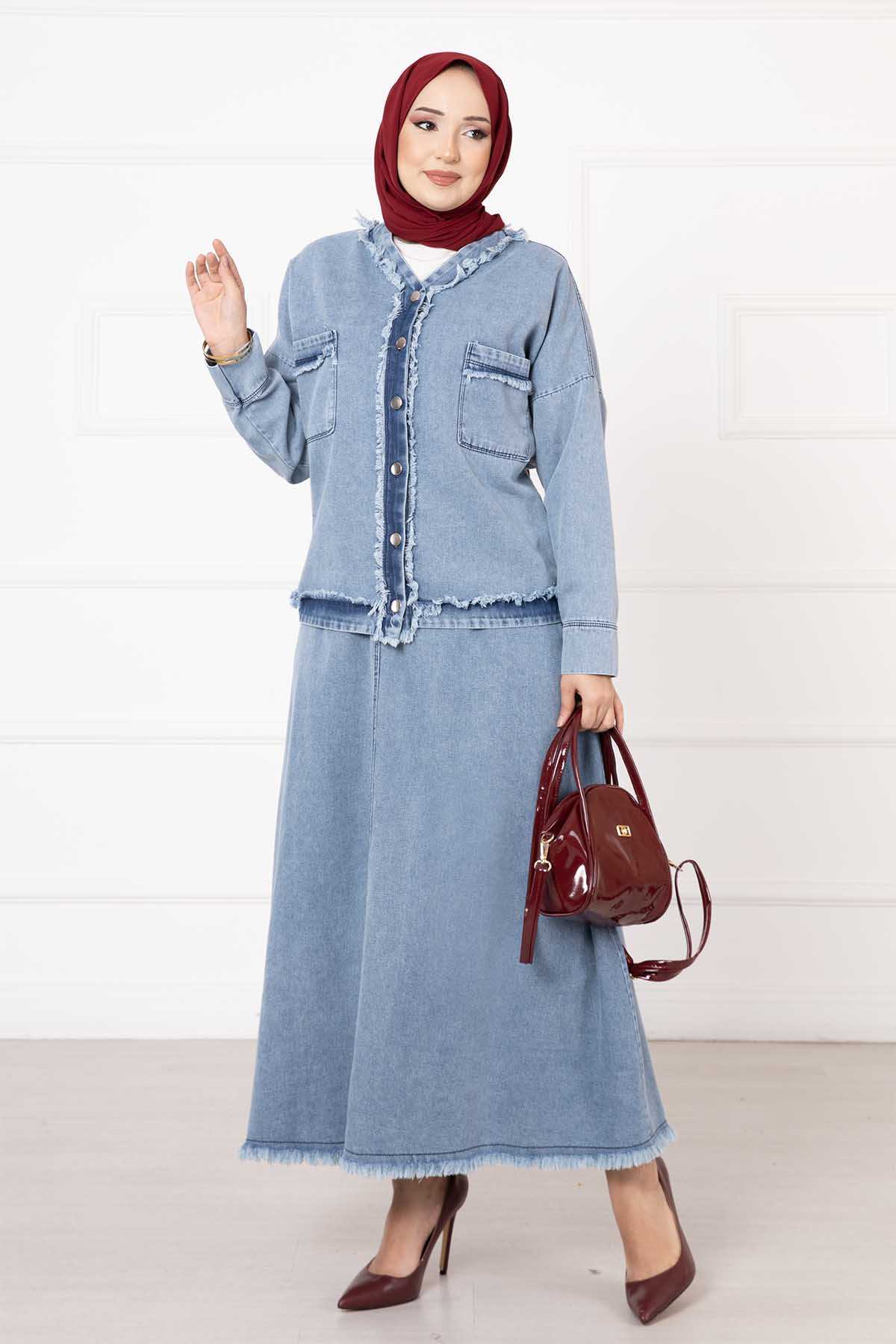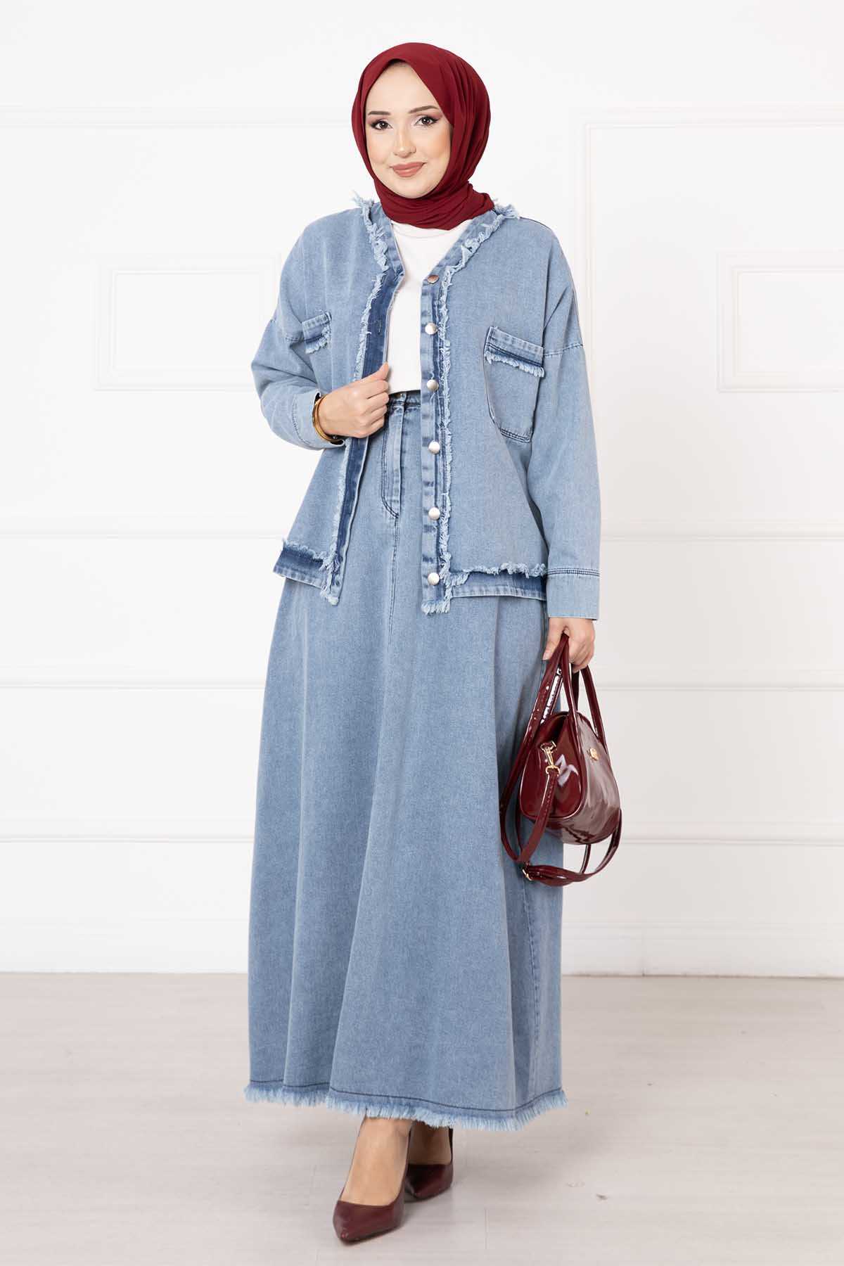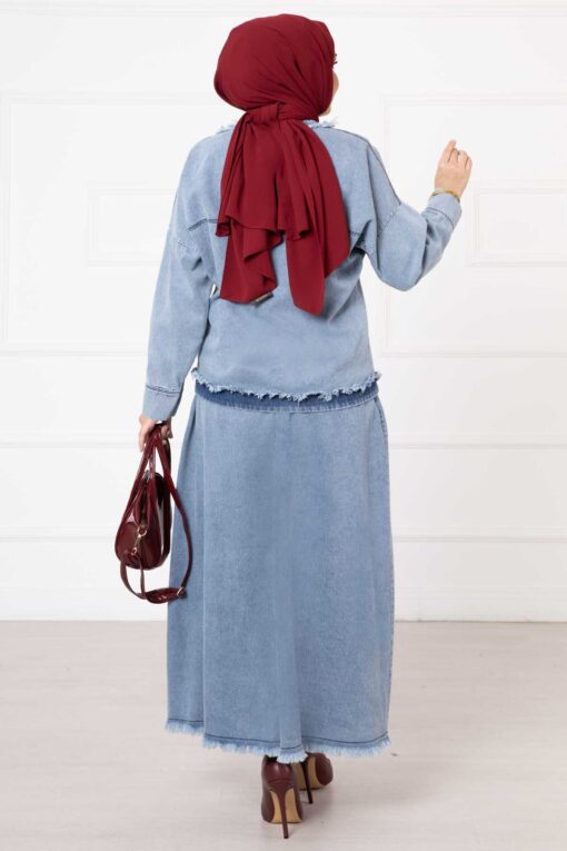 المنتج موسمي. المنتج يتكون من قطعتين: سترة وتنورة. السترة لها أزرار أمامية وجيوب. التنورة مزودة بأزرار وسحّاب الطول: تونيك 60 سم التنورة: 100 سم قد يكون هناك مرونة في الطول من 1 إلى 3 سم ميزة القماش: مصنوع من قماش الدنيم. نظرًا لأن المنتج عبارة عن قالب كامل، يوصى بطلب المقاس الذي تستخدمه عادةً. قياسات الموديل: المقاس 38 / الارتفاع 1.66 سم / الورك 90 سم / الخصر 77 سم / الصدر 90 سم قد يكون هناك اختلاف في لون المنتج بسبب التصوير. الشال المستخدم في هذا المنتج