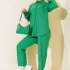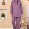 المنتج موسمي. يتكون المنتج من قطعتين: تونيك وبنطلون. تحتوي السترة على رقبة دائرية ووشاح مخيط على الكتف. خصر البنطال مرن.