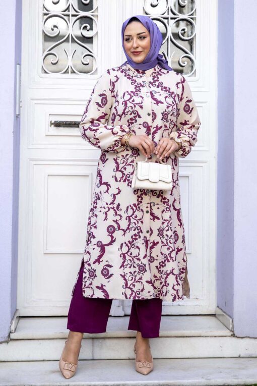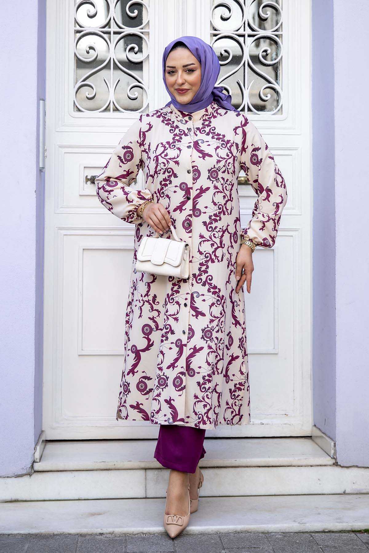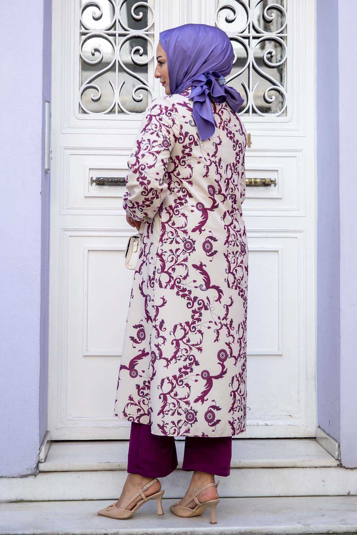 المنتج موسمي. يتكون المنتج من قطعتين: تونيك وبنطلون. يحتوي التونيك على أزرار في الأمام وتفاصيل شق على الجانبين، ويتميز البنطلون بخصر مطاطي وقصة مريحة للغاية.