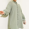 المنتج موسمي. يحتوي القميص على أزرار في جميع أنحائه وجزء أمامي برباط. يوجد تجعيد طفيف عند الحافة.