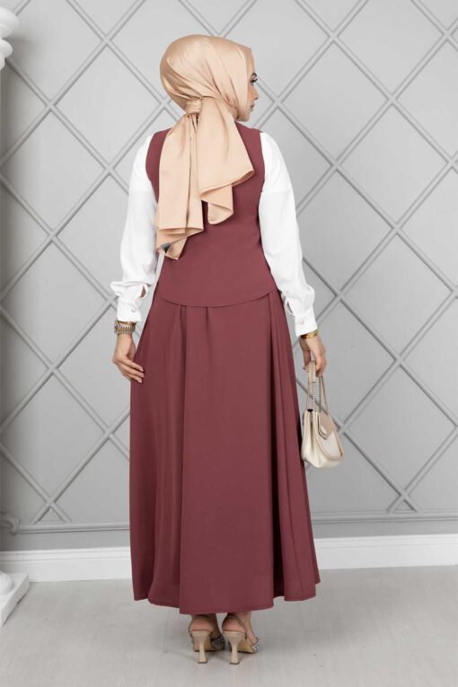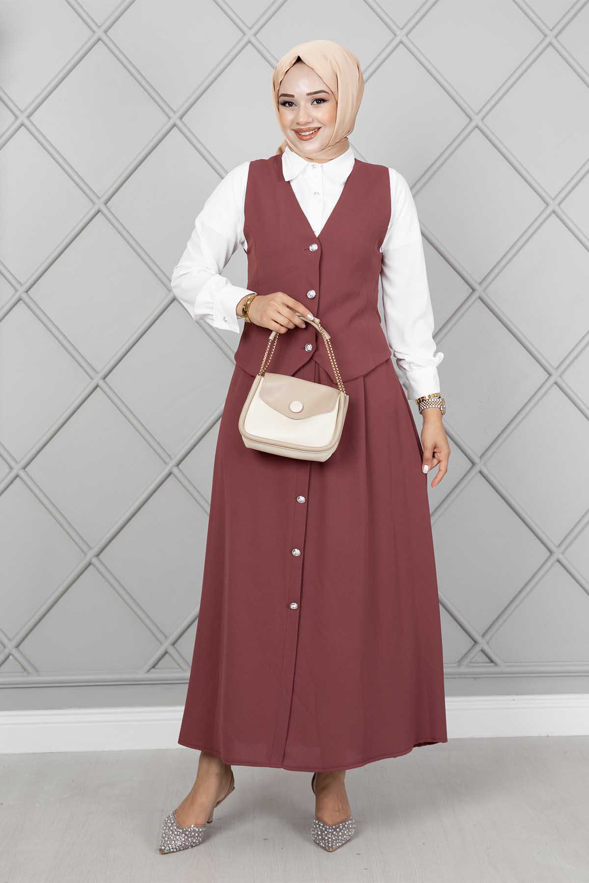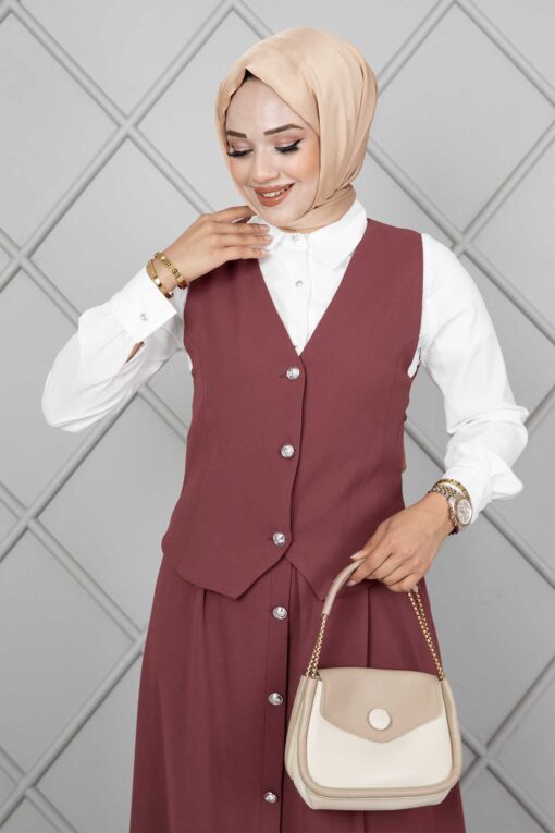 المنتج موسمي. يتكون المنتج من ثلاث قطع: سترة وقميص وتنورة. يتميز العرف برقبة على شكل حرف V، مع أزرار نشطة، والجزء الأمامي من القميص مزرر بالكامل، والتنورة بها زر بسحاب على الجانب.