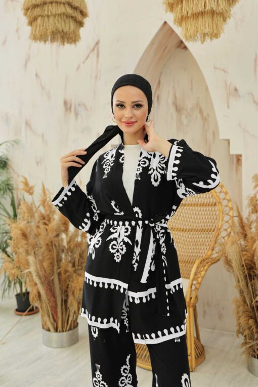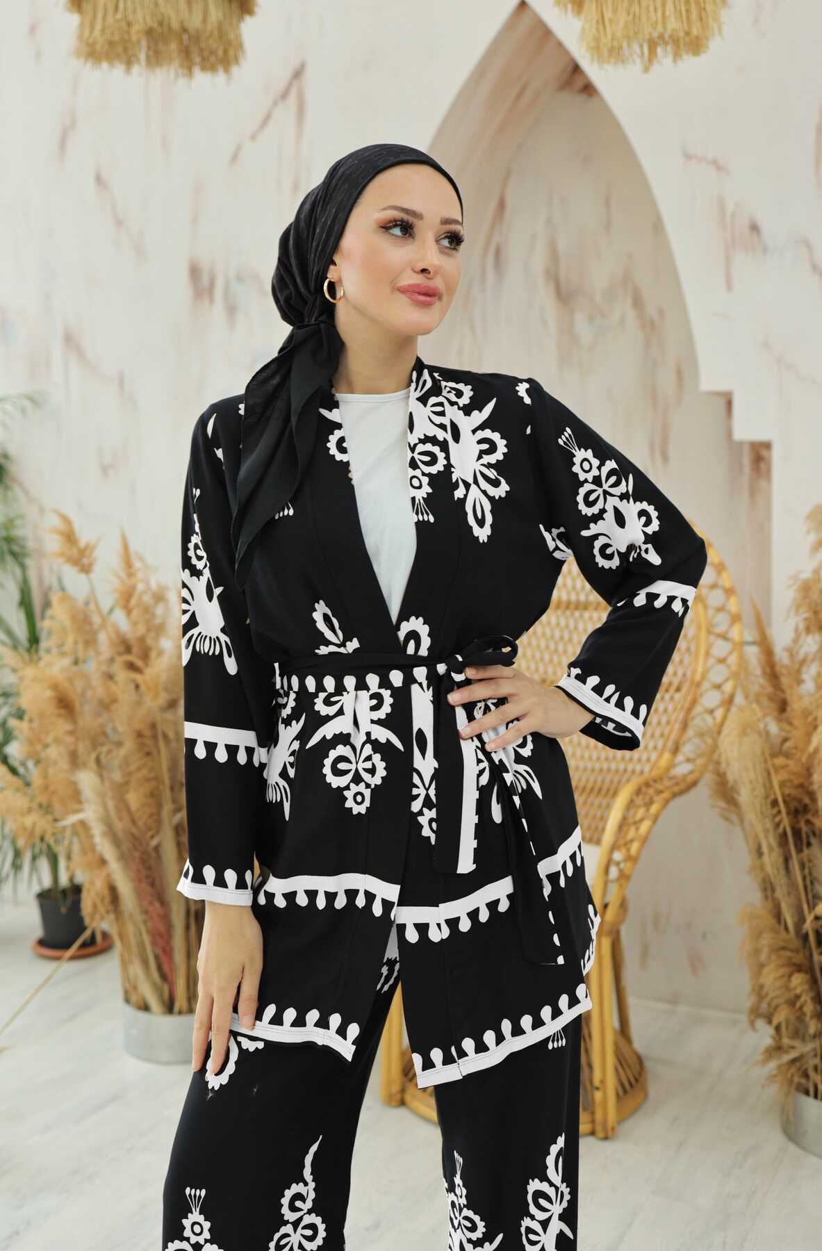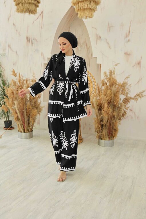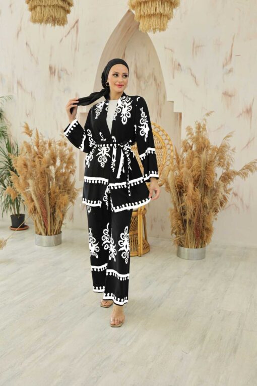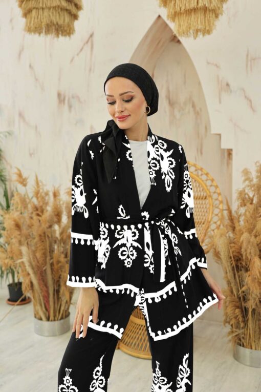 المنتج موسمي. يتكون المنتج من قطعتين: الكيمونو والبنطلون. يحتوي خصر الكيمونو على حزام متحرك. يتميز البنطلون بخصر مطاطي وهو بدلة مريحة للغاية.