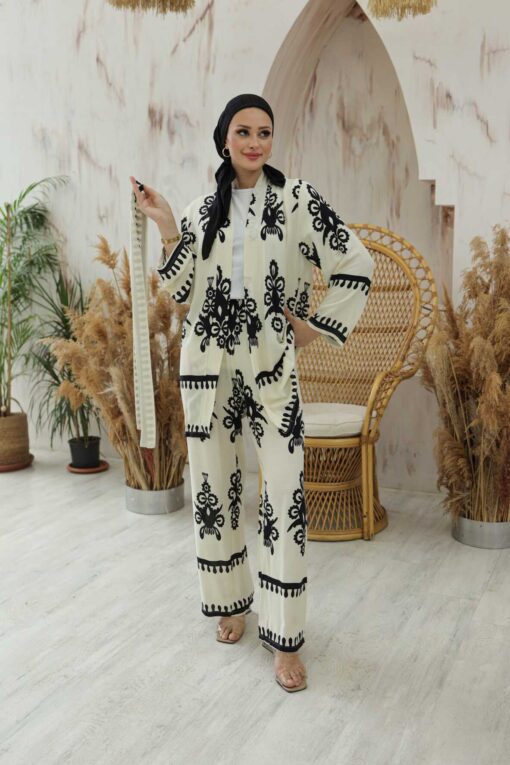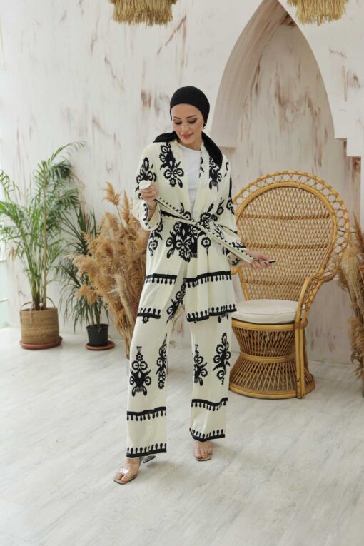 المنتج موسمي. يتكون المنتج من قطعتين: الكيمونو والبنطلون. يحتوي خصر الكيمونو على حزام متحرك. يتميز البنطلون بخصر مطاطي وهو بدلة مريحة للغاية.