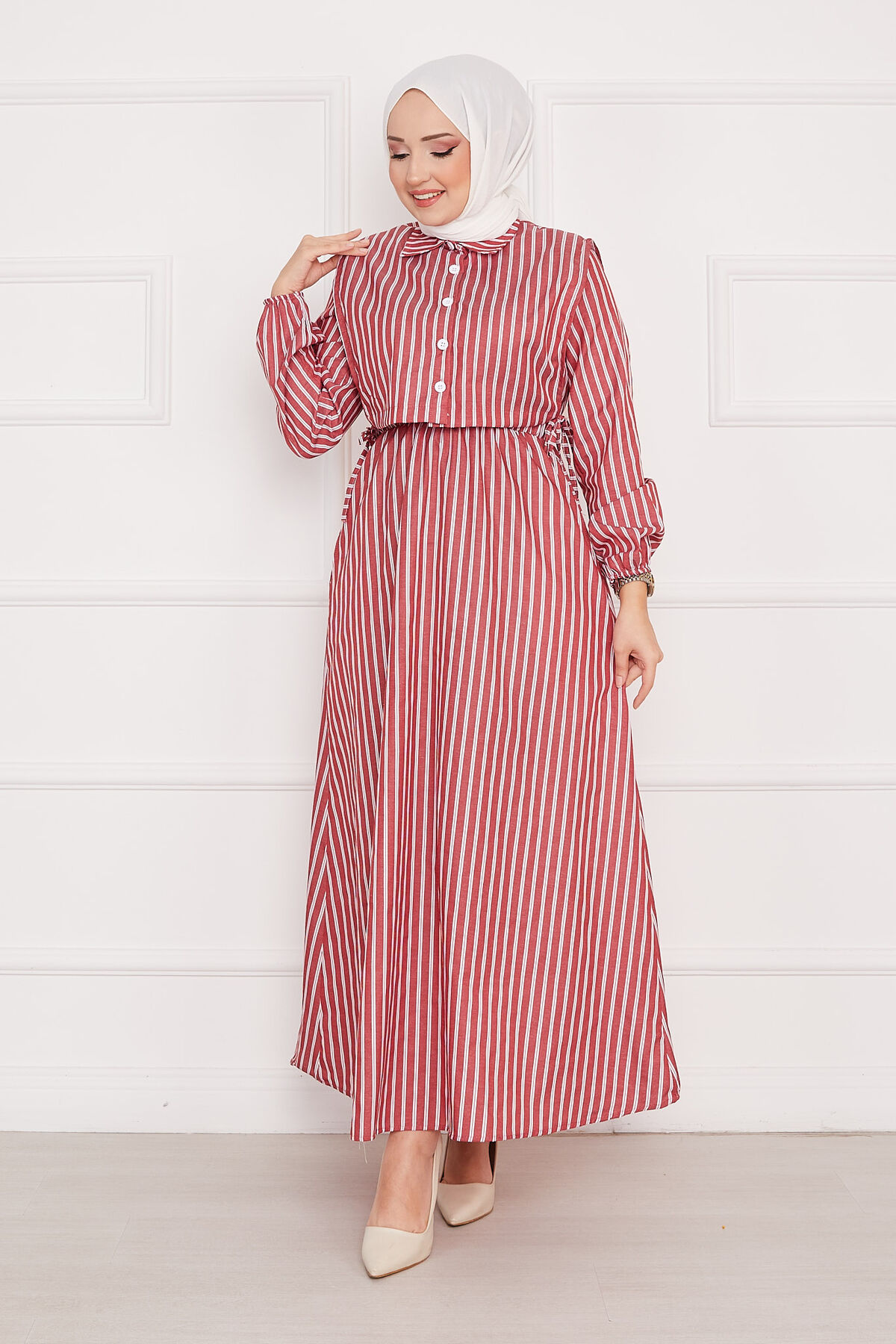 فستان بوليرو مخطط للموسم الجديد له أكمام طويلة. الفستان الداخلي ذو الخصر المطاطي سيجعلك تبدين أكثر رشاقة وأناقة. ستكون القطعة المفضلة في خزانة ملابسك وستكون قطعة النجمة التي يمكنك دمجها بشكل أنيق ورياضي.