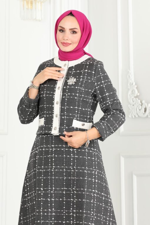 البدلة المزدوجة المصنوعة من التويد هي منتج حجاب نموذجي. يمكن استخدامه في فصلي الخريف والشتاء. يجب غسله على درجة حرارة 30 درجة دون عصر. وهي مصنوعة من قماش التويد من الدرجة الأولى. المنتج عبارة عن رقبة دائرية. إنه غير مُبطن. (حجم المنتج الموجود في العارضة هو 38.) ويحتوي على أزرار قابلة للاستخدام في المقدمة. الخصر تنورة لديه سحاب. تفاصيل الجيب هي ملحق.