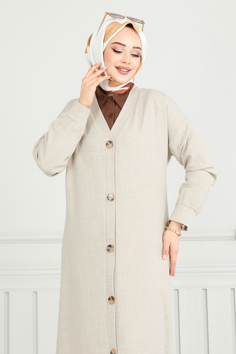 عباءة الكتان ذات الأزرار الأمامية هي منتج حجاب نموذجي ومناسبة للاستخدام في جميع المواسم. المنتج مصنوع من قماش صوفيا كتان عالي الجودة ويمكن غسله على درجة حرارة 30 درجة للغسيل الدقيق. تتميز هذه العباءة بتصميم رقبة على شكل حرف V وأزرار على طول الجزء الأمامي وهي غير مبطنة. المقاس 38 على الموديل هو مثال.