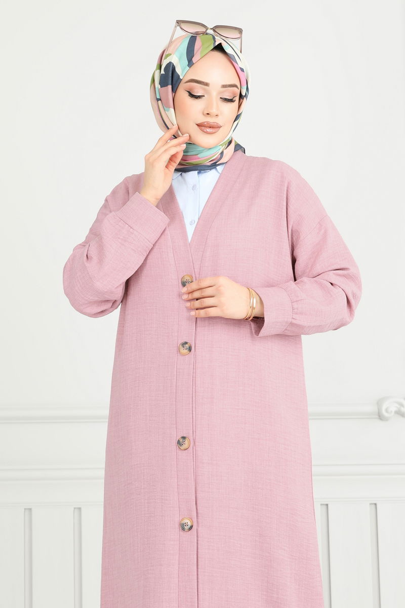 عباءة الكتان ذات الأزرار الأمامية هي منتج حجاب نموذجي ومناسبة للاستخدام في جميع المواسم. المنتج مصنوع من قماش صوفيا كتان عالي الجودة ويمكن غسله على درجة حرارة 30 درجة للغسيل الدقيق. تتميز هذه العباءة بتصميم رقبة على شكل حرف V وأزرار على طول الجزء الأمامي وهي غير مبطنة. المقاس 38 على الموديل هو مثال.