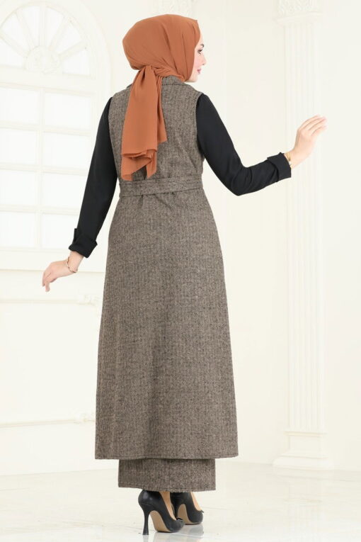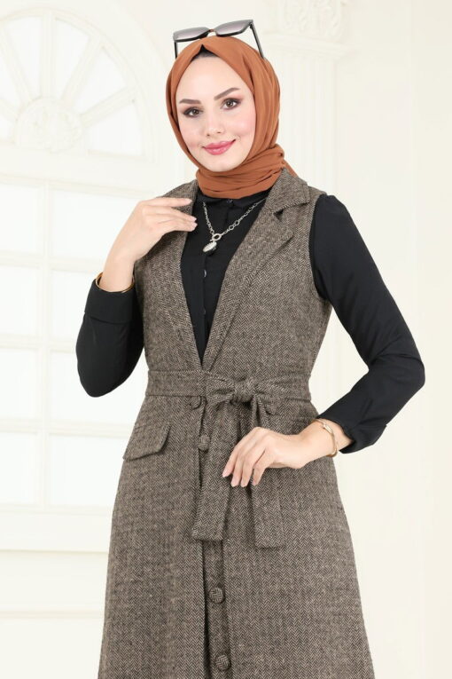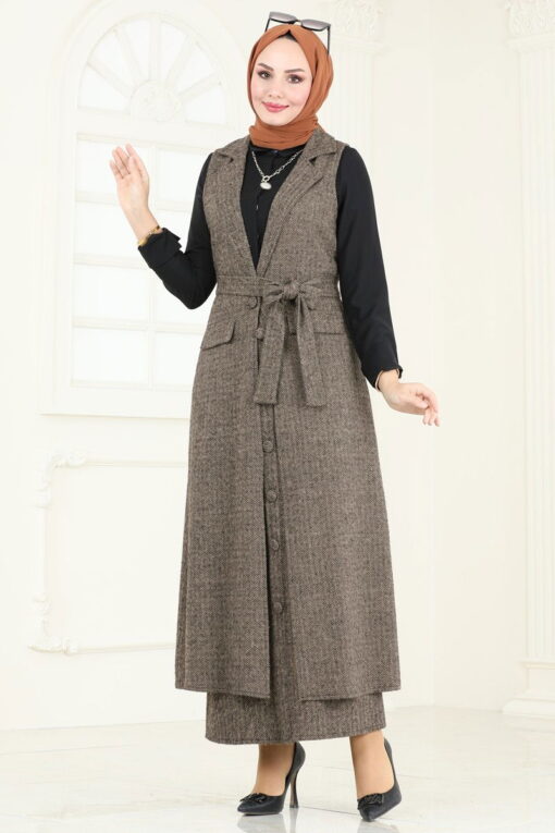 موديل البدلة ذات الأزرار هو منتج للحجاب، يمكن استخدامه في فصلي الخريف والشتاء، ويجب غسله عند درجة حرارة 30 درجة، وهو مصنوع من قماش التويد، وياقة مزدوجة الصدر (المنتج الموجود بالموديل مقاس 38). تحتوي السترة على زر يمكن استخدامه من الأمام، ولها زرين لمنع ترفرف الحزام، النهاية مخيطة، ويترك الجزء الأوسط فارغًا (غير مخيط). الحزام متضمن في المنتج، ولا يجوز استخدامه بشكل اختياري. تم صنع مزيج من قميص/سترة لإظهار الاستخدام المقصود للمنتج، كما أن تفاصيل الجيب هي أحد الملحقات.