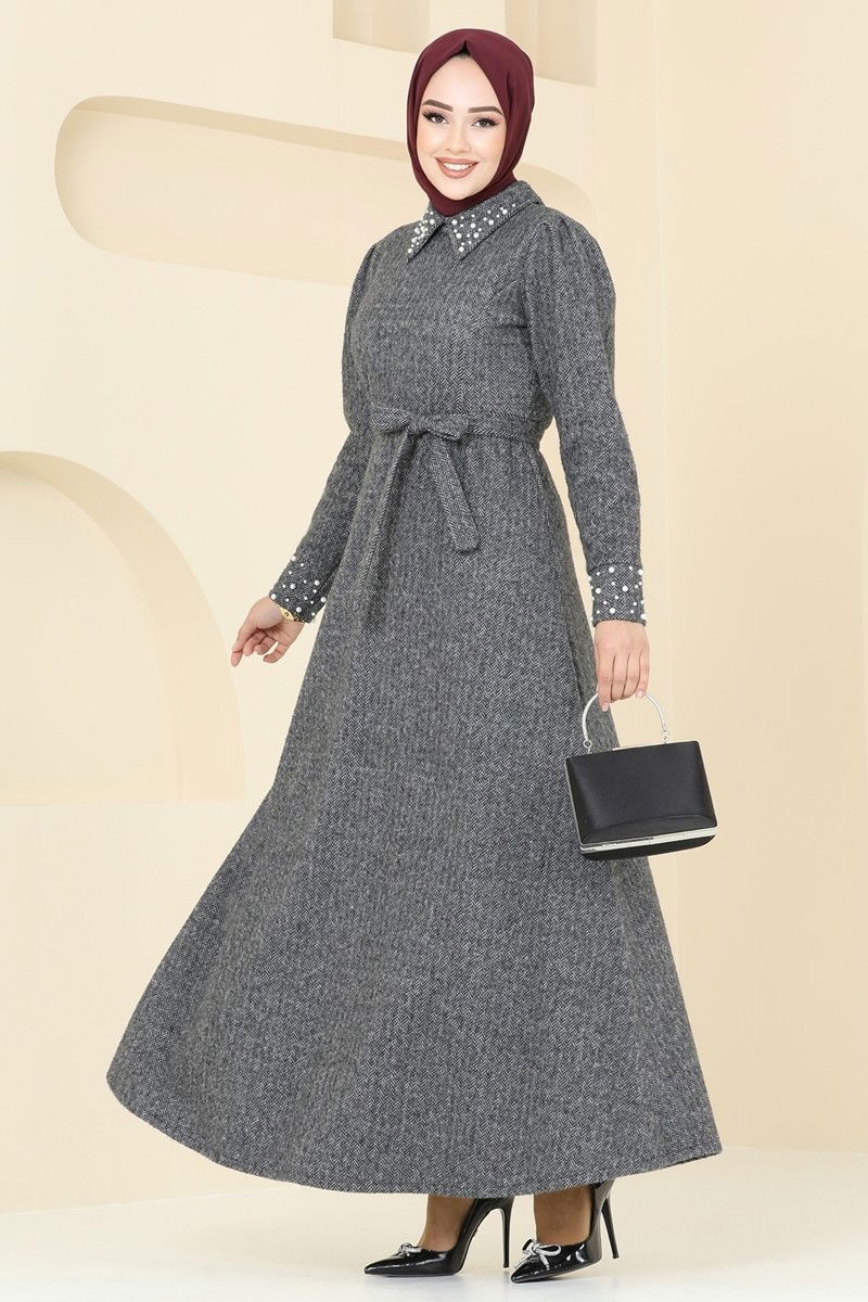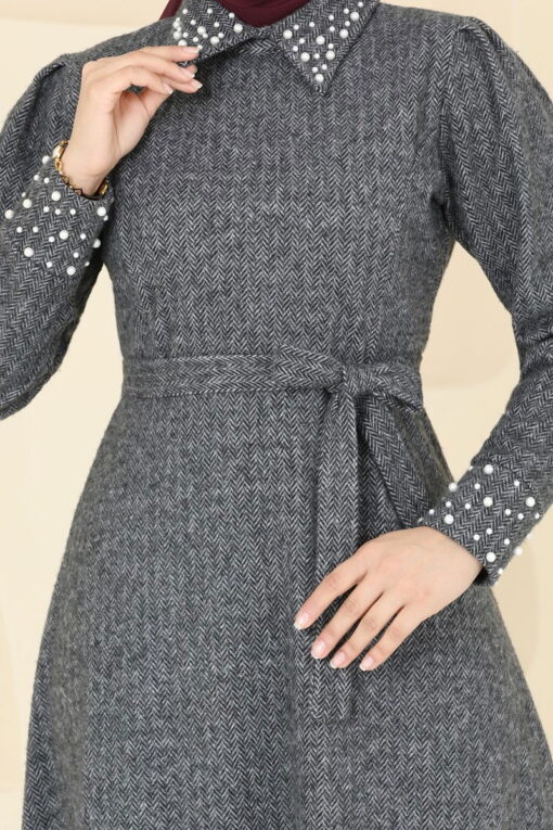 نموذج فستان متعرج مزين باللؤلؤ هو منتج للحجاب. يمكن استخدامه في فصلي الخريف والشتاء. يجب غسله على درجة حرارة 30 درجة دون عصر. المنتج عبارة عن ياقة قميص. إنه غير مُبطن. المنتج مزود بسحاب في الخلف. (المنتج الموجود في الموديل هو مقاس 38.) لمنع الحزام من الرفرفة، يتم خياطة كلا الطرفين، ويترك الجزء الأوسط فارغًا (غير مخيط). الحزام متضمن في المنتج، ولا يجوز استخدامه اختياريًا. تفاصيل اللؤلؤ مرصعة.