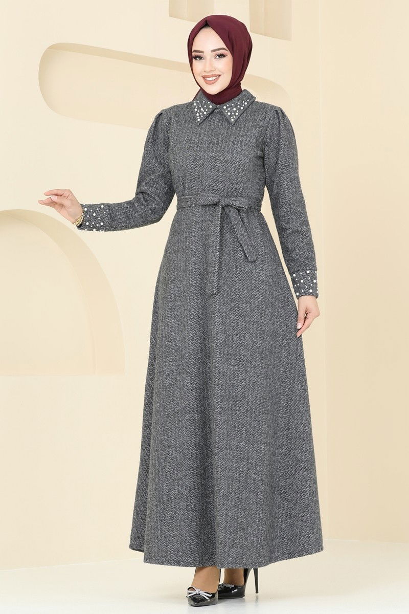 تفاصيل المنتج: إنه منتج أزياء الحجاب للموسم الجديد. المنتج عبارة عن ياقة قميص. إنه غير مُبطن. المنتج مزود بسحاب في الخلف. الحزام متضمن في المنتج، ولا يجوز استخدامه اختياريًا. تفاصيل اللؤلؤ مرصعة. قد تكون هناك اختلافات في درجة لون المنتج بسبب التصوير الفوتوغرافي.