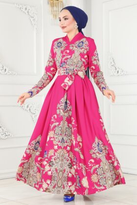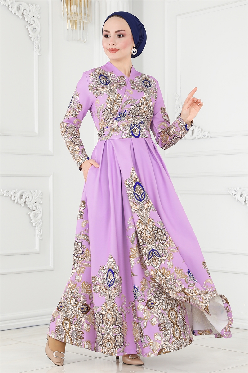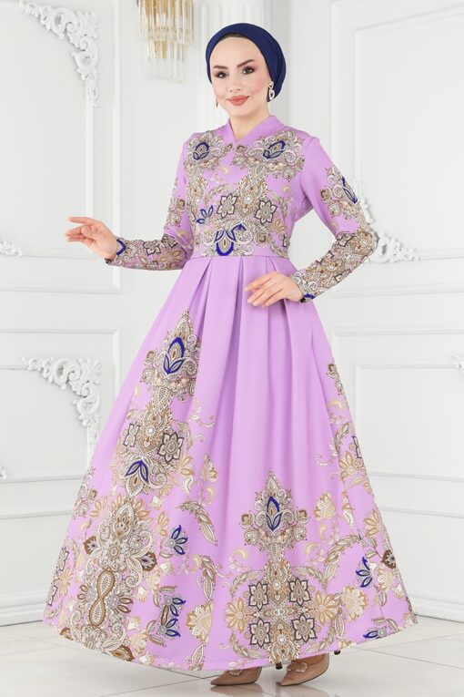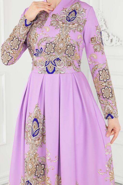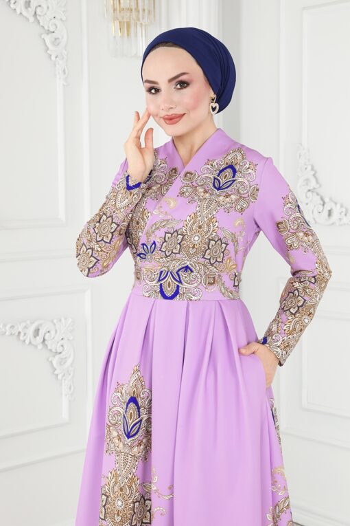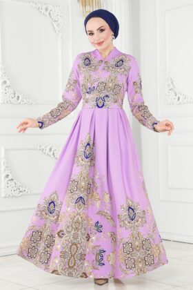 فستان أطلس بياقة مزدوجة الصدر يتميز باللون الأرجواني