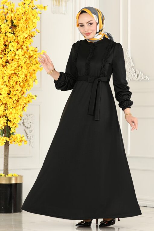 فستان حجاب بتفاصيل كشكش، يتميز باللون الأحمر