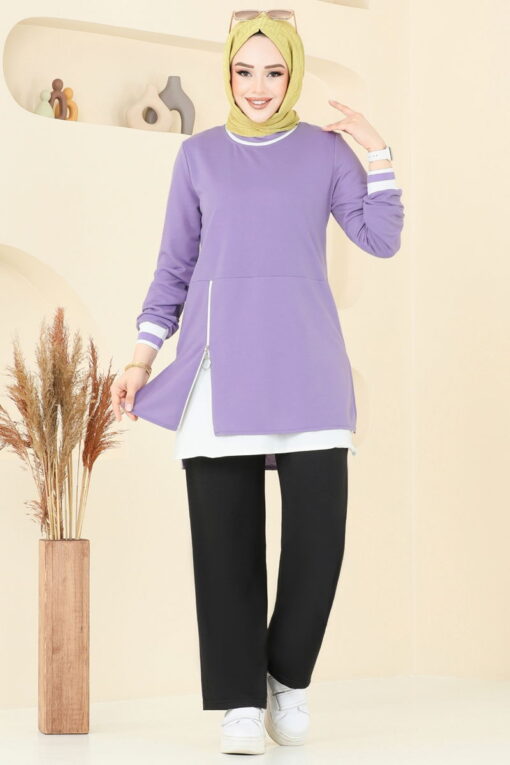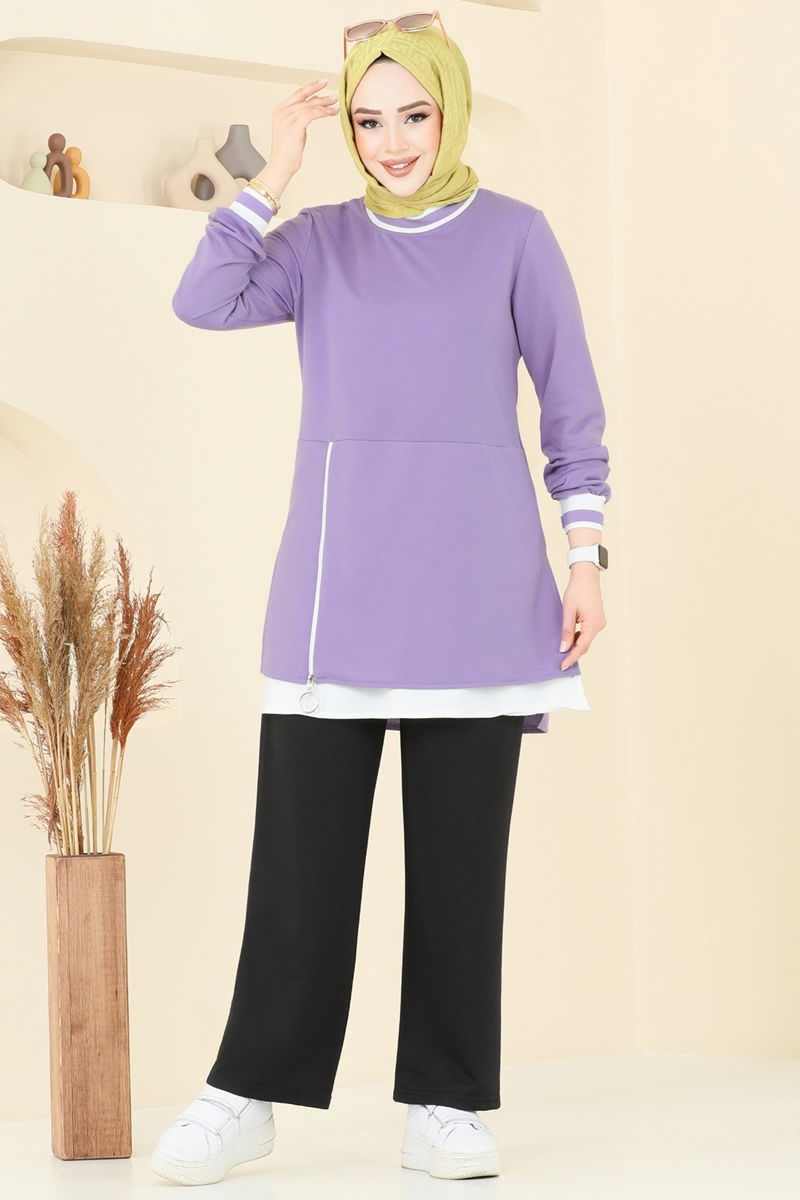 إذا كنت تبحثين عن ملابس محتشمة أنيقة ومريحة، فإن البدلة المحتشمة ذات التفاصيل السحابية هي الخيار الأمثل لك! يمكنك استخدام هذه المجموعة بشكل مريح في جميع فصول السنة، ويمكن تنظيفها بغسيل خفيف على درجة حرارة 30 درجة. مصنوع من قماش ذو خيطين، يتضمن هذا المنتج رقبة دائرية، وقميصًا بفتحة جانبية، وبنطلونًا بخصر مطاطي. هذه المجموعة، التي تحتوي على تفاصيل سحاب كإكسسوارات، تسمح لك بالحفاظ على أناقتك في أي بيئة. المنتج الموجود على الموديل هو مقاس 38 ويتم دمج السترة الداخلية والبنطلون.