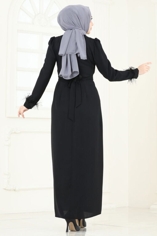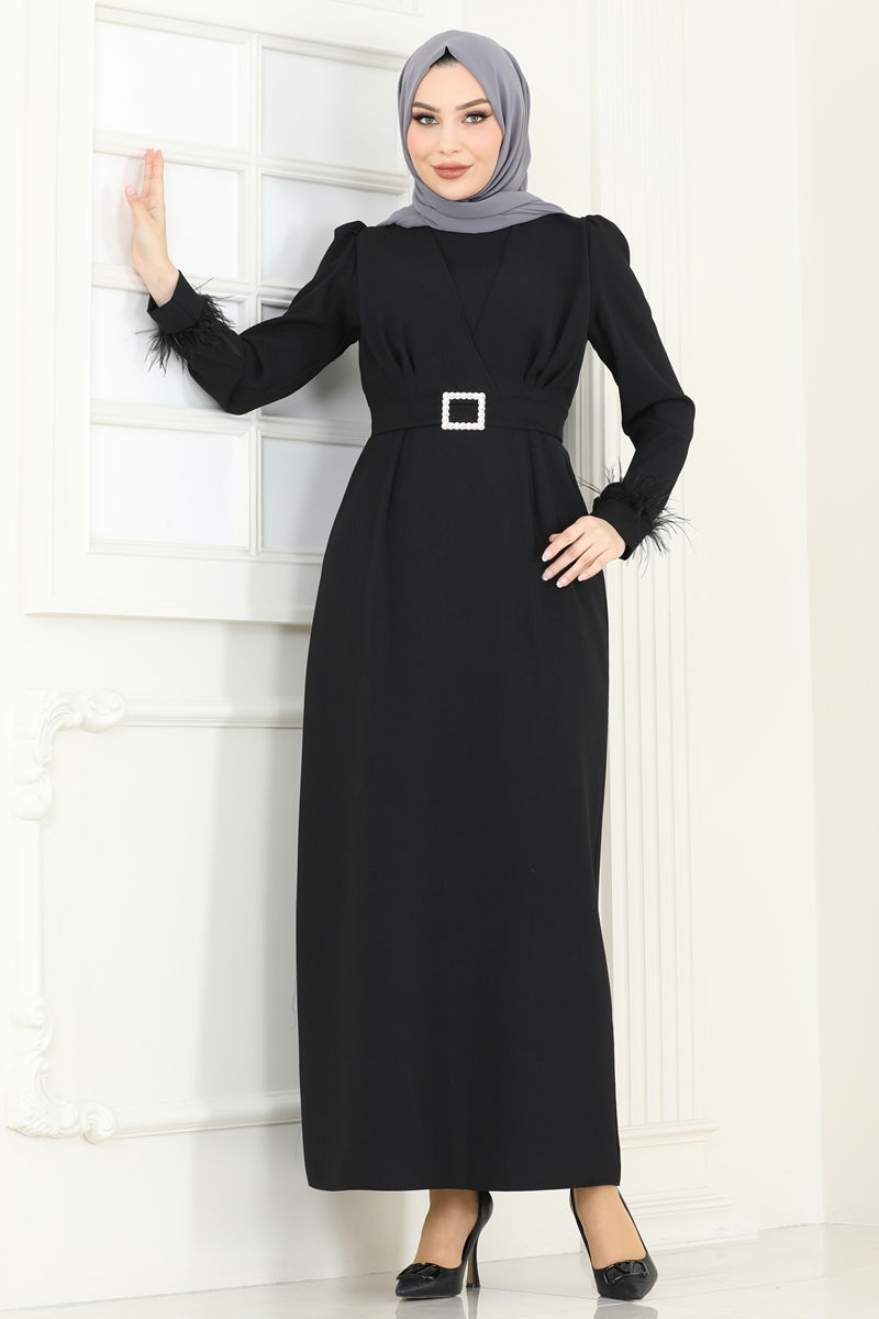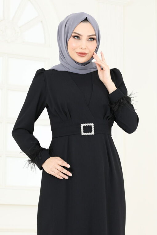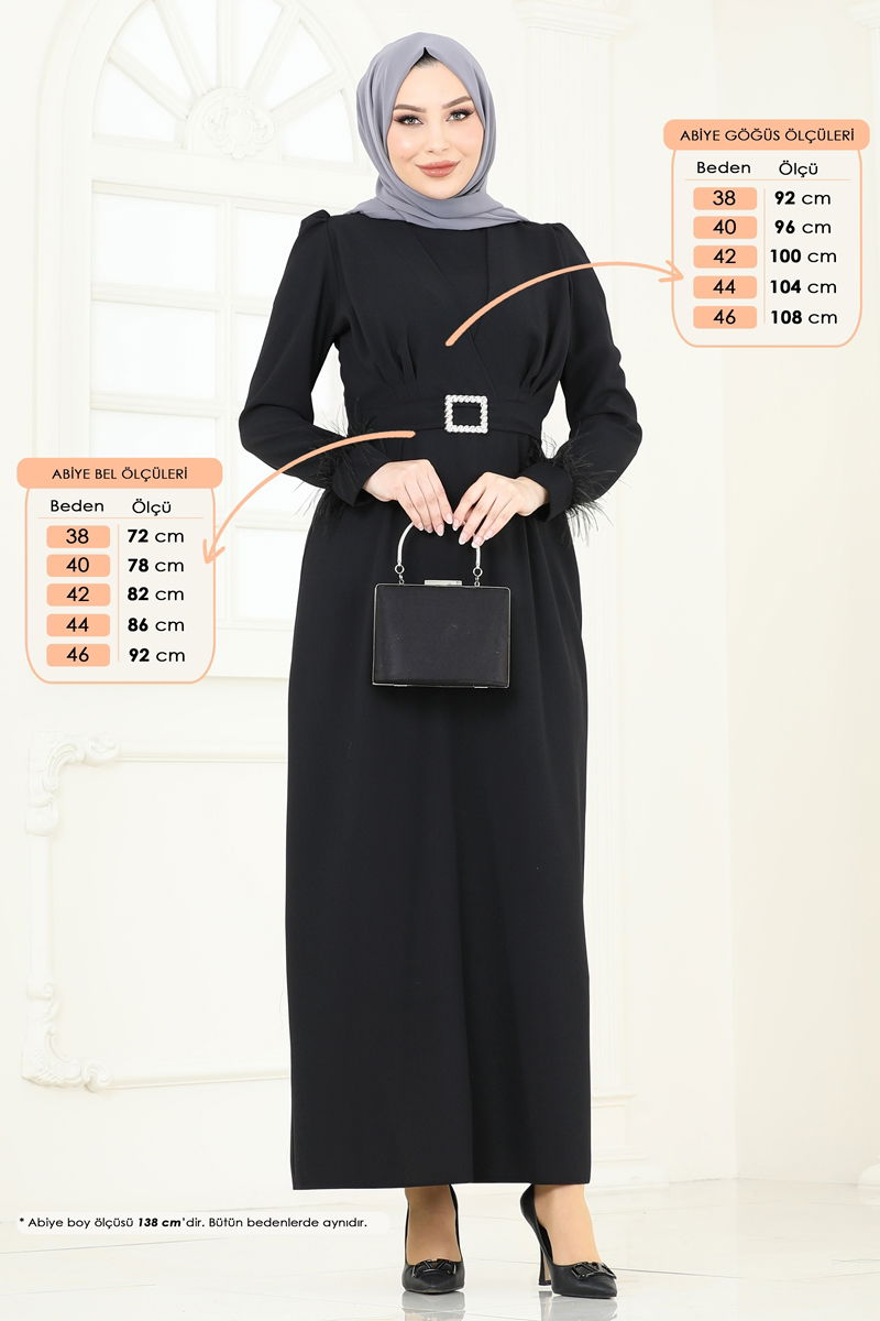 هذا الفستان المسائي الأنيق ذو الحزام الحجري، باعتباره أحد منتجات الحجاب النموذجية، يسمح لك بالحفاظ على أناقتك طوال الفصول الأربعة. هذا الفستان الذي يتم تنظيفه جافًا فقط مصنوع من قماش الكريب وله رقبة دائرية. إنه يوفر استخدامًا مريحًا بتصميمه غير المبطن وبنية السحاب الخلفي. في هذا الموديل المزين بالريش الأنيق، تضيف تفاصيل الحزام لمسة براقة. يتم تأمين الحزام من كلا الطرفين ويترك دون خياطته في المنتصف ويأتي مع الفستان، ولكن يمكن إزالته إذا رغبت في ذلك.