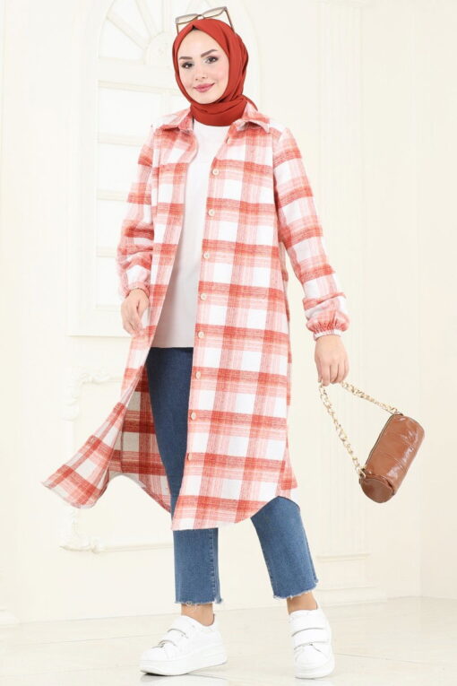 تونيك منقوش بياقة قميص هو منتج نموذجي للحجاب. يمكن استخدامه في فصلي الخريف والشتاء. يمكن غسلها عند 30 درجة دون كتابة (غسيل دقيق) وهي مصنوعة من قماش منقوش. المنتج عبارة عن ياقة قميص. المنتج مزود بأزرار في الأمام. إنه غير مُبطن. (المنتج الموجود في العارضة مقاس 38.) الارتفاع: 160 سم، الصدر: 86 سم، الخصر: 68 سم، الأرداف: 95 سم، الوزن: 55 كجم. الكفة مرنة.