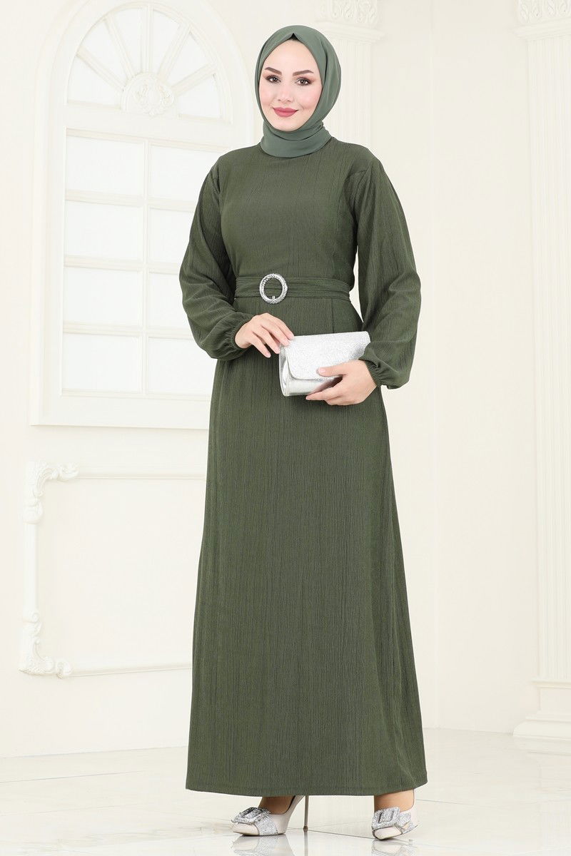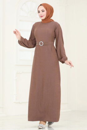 فستان أنيق مع حزام حجري هو موديل للحجاب ومناسب لفصلي الخريف والشتاء. المنتج المناسب للغسيل الدقيق، مصنوع من قماش كارين وغير مبطن. يتميز برقبة دائرية ويناسب من يبلغ طولهم 160 سم، ومقاس الصدر 86 سم، ومقاس الخصر 68 سم، ومقاس الورك 95 سم، ووزنه 55 كجم. يلبس الثوب من الرأس، ويخيط طرفي الحزام ويترك الوسط فارغا (غير مخيط). الحزام متضمن في المنتج ولكن يمكن استخدامه اختياريًا. بالإضافة إلى ذلك، الكفة مرنة.